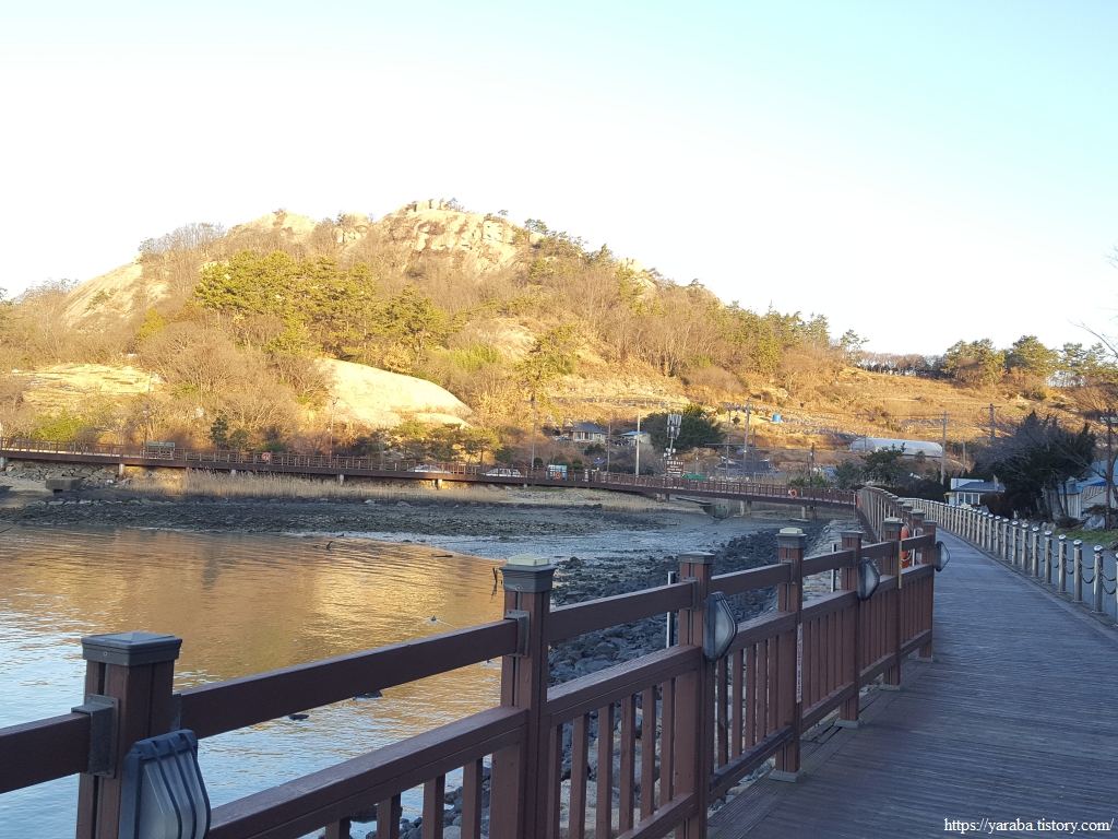 수로 옆 산책로를 걸어 해안에 이르면 수로 끝자락에 설치한 인도교를 따라서 수로 건너편으로 넘어가 길을 이어간다.