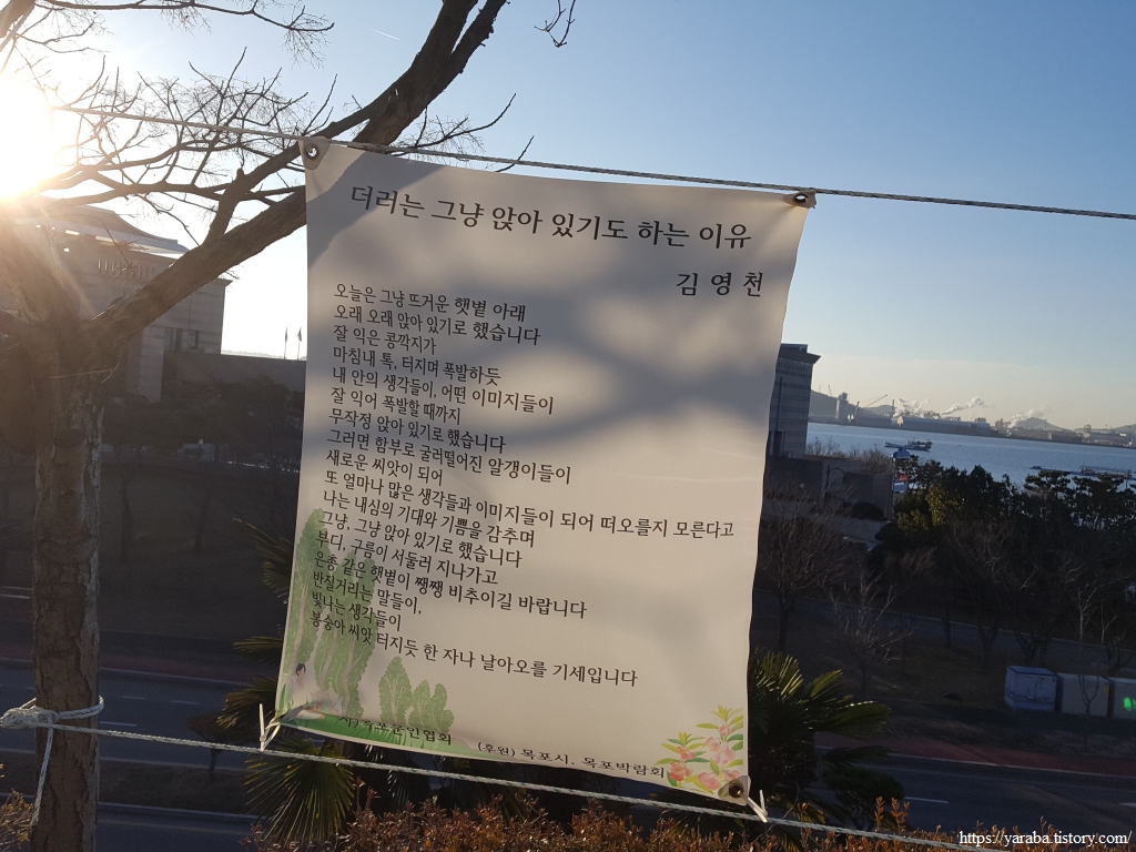 목포문학관 앞에 걸린 시들을 읽으며 지나가는데, 시 한 편에 발길이 멈춘다. 콩을 말려본 사람이 공감하는 시, 따스한 햇살을 받으며 읽기 좋은 시였다. 김영천 님의 "더러는 그냥 앉아 있기도 하는 이유"라는 시이다.