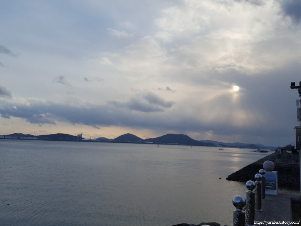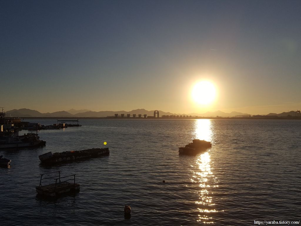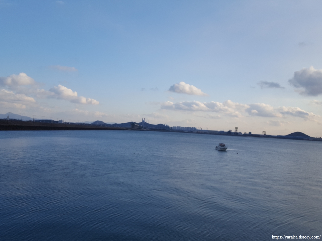 해안으로 나오니 좌측으로는 영산강 하구둑과 넓은 바다가 우리를 맞는다. 서쪽 하늘에는 짙은 먹구름이 다가오며 석양을 가린다.