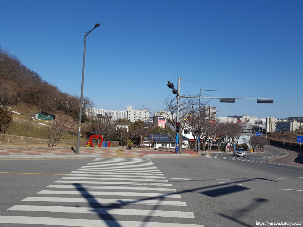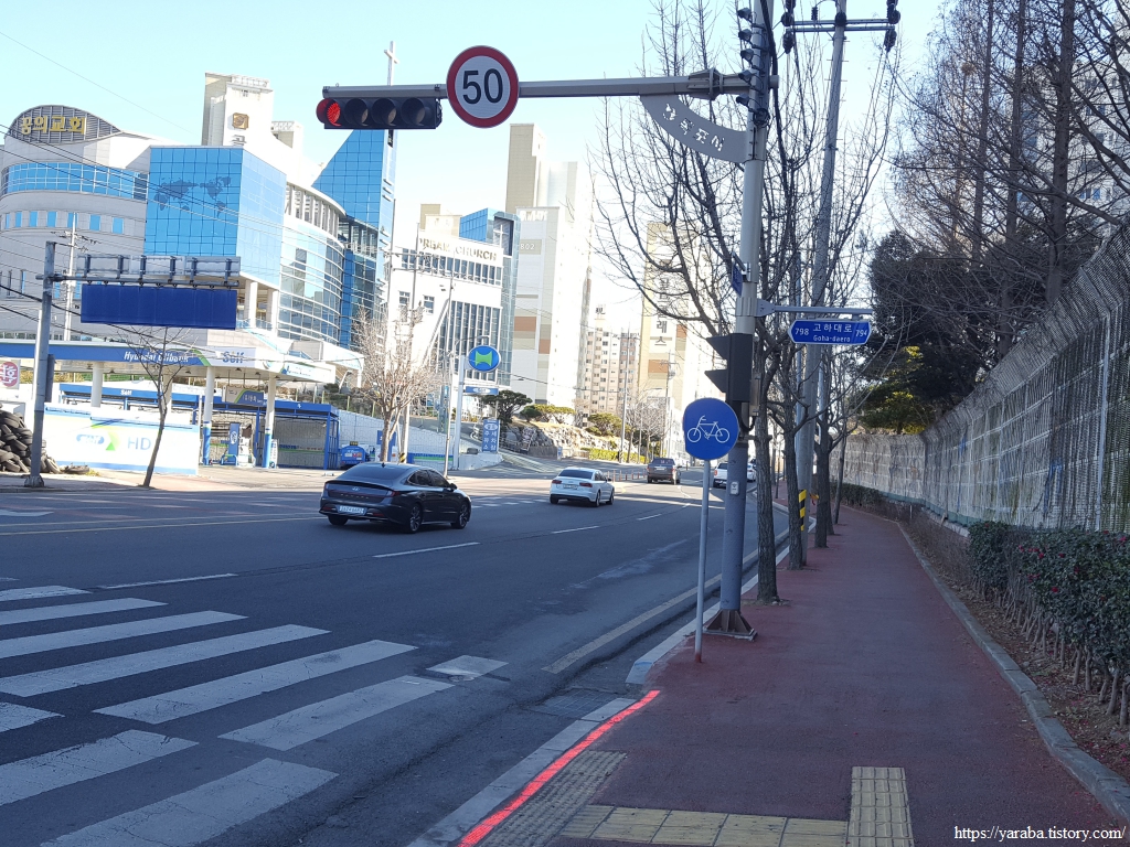 고하대로 옆 인도를 따라 연산동교차로까지 올라온 길은 우회전하여 횡단보도를 건너서 유방산 방면으로 이동한다.