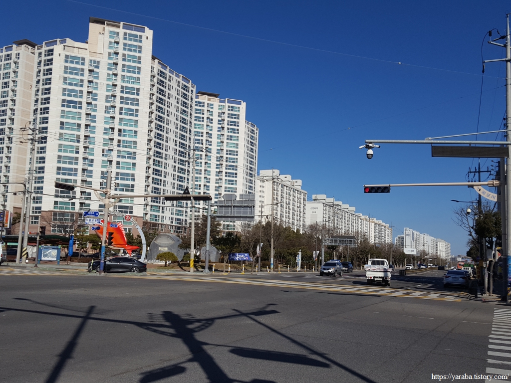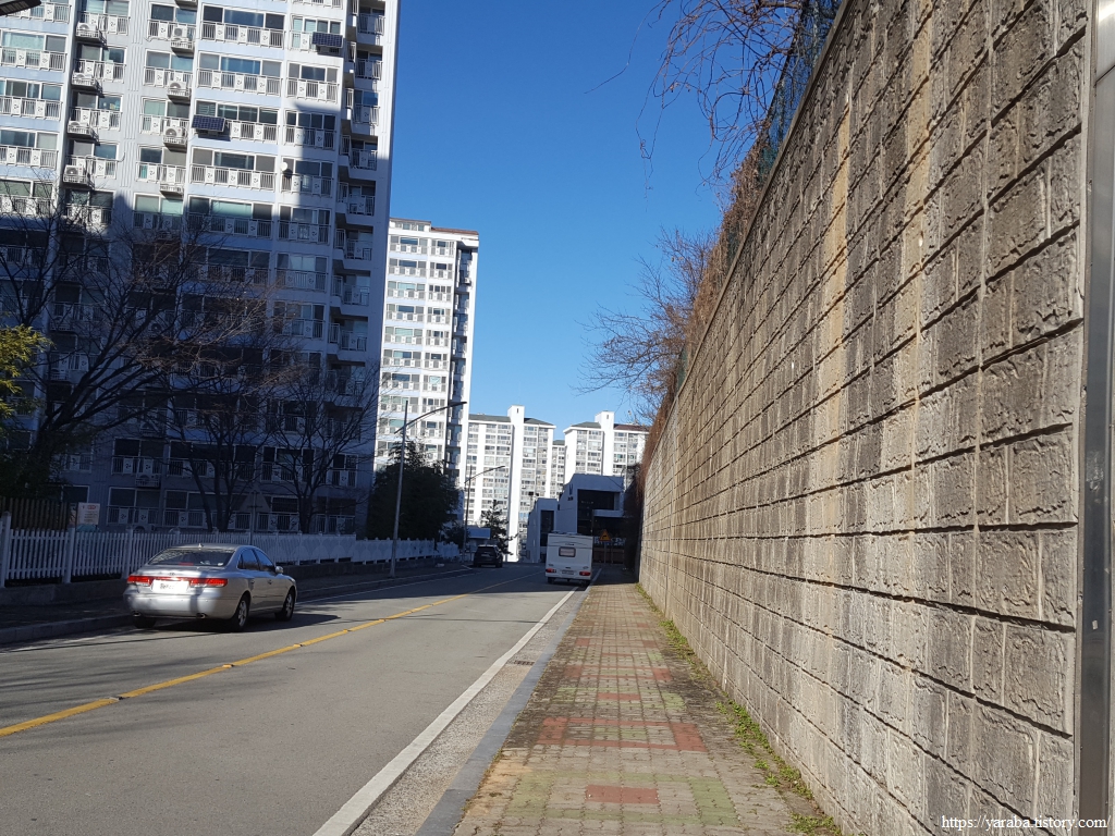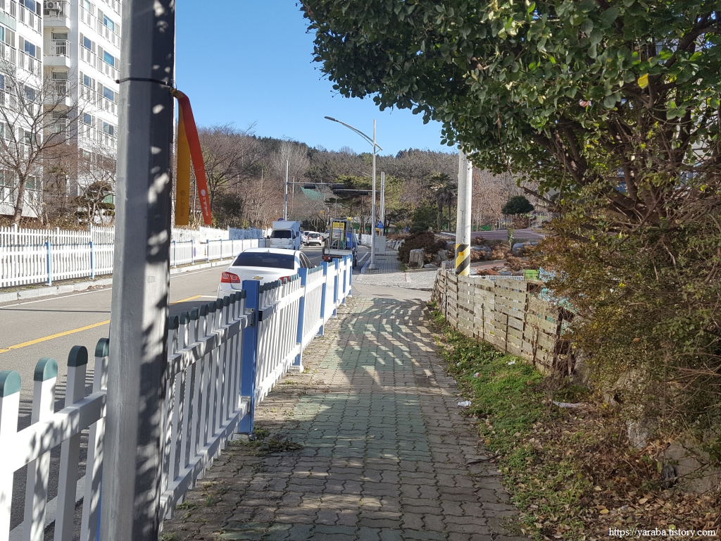 산을 내려온 길은 아파트 단지 뒤를 돌아서 용당로 큰길로 나간다.