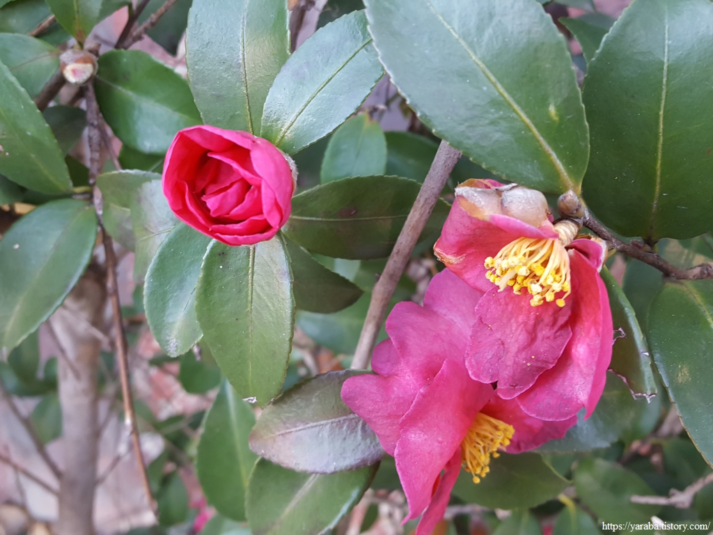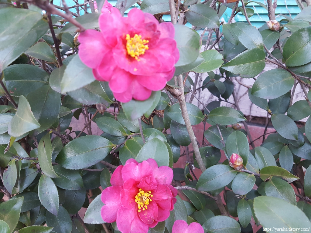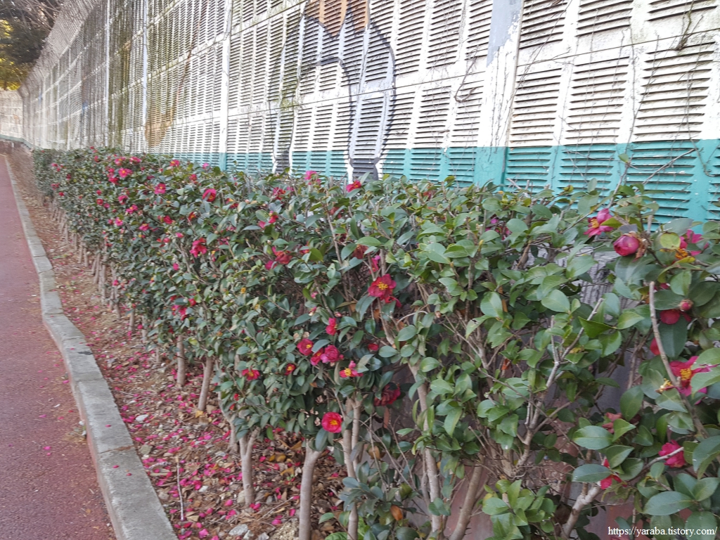 방음벽 아래로 애기 동백들을 관목처럼 심어 놓았다. 넉넉한 공간에 가로수로 심어 놓은 것은 여러 번 보았지만 이렇게 좁은 공간에 자리한 애기 동백은 처음이다. 그럼에도 차가운 겨울 한복판에 붉은빛으로 이 공간을 빛내고 있다.