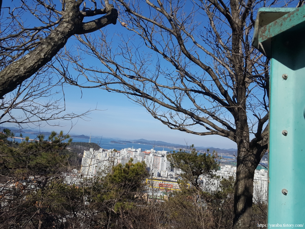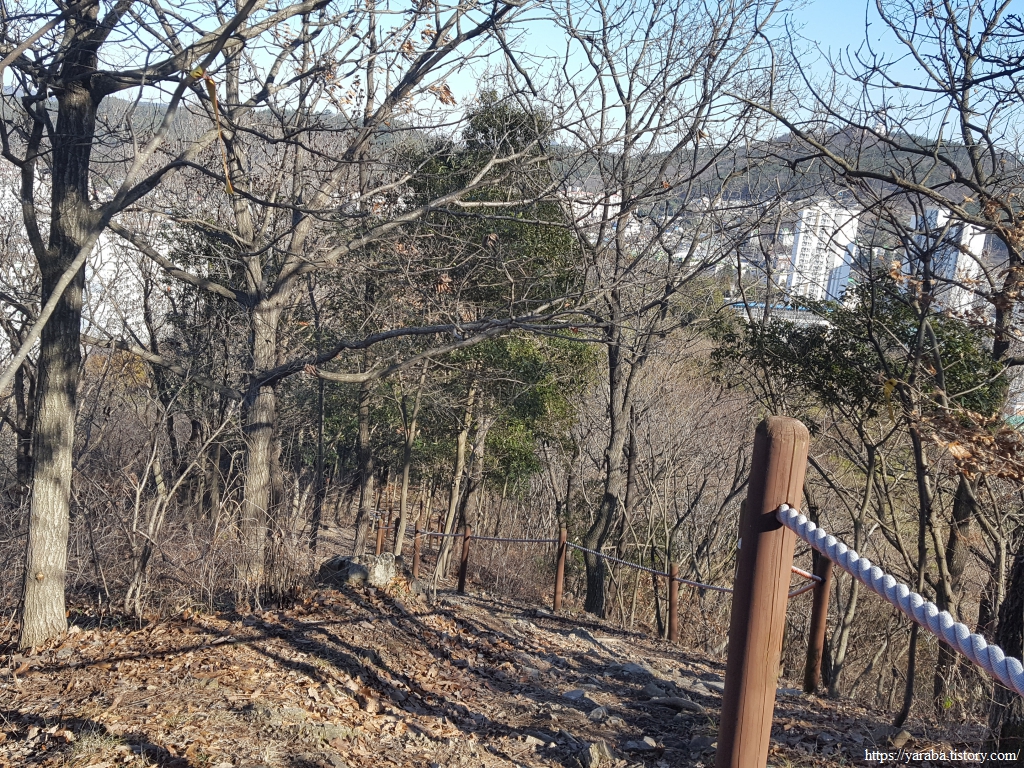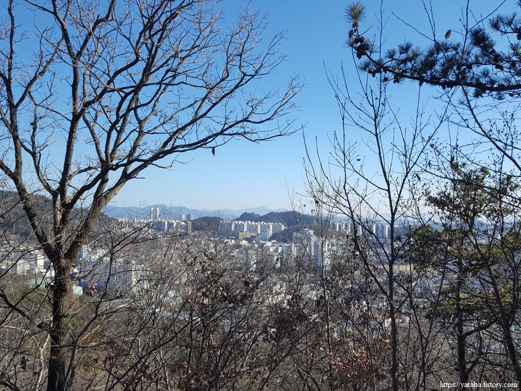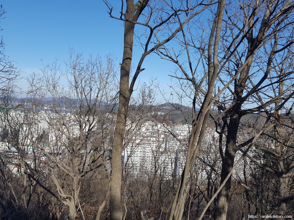 나무 사이로 보이는 풍경은 아파트숲이다. 어찌 되었든 아파트 단지 인근의 산들은 좋은 산책로가 될 수밖에 없음을 인정하게 된다.