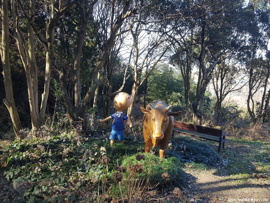 누렁이를 데리고 가는 아이 조형물은 그 시절 우리 조상들의 삶과 함께 했던 소의 모습을 떠올리게 한다. 지금은 느리게 사는 삶의 정겨움이 사라지고 있으니 안타까울 뿐이다. 자본과 금융이 농촌을 지배하는 모습, 트랙터와 그저 먹이고 살만 찌우는 소 농장이 태반인 팍팍함만 남았다. 소와 함께 했던 농촌의 모습은 박물관의 유물처럼 찾아보기 힘들어졌다.