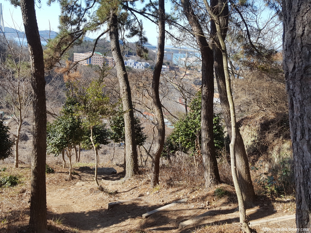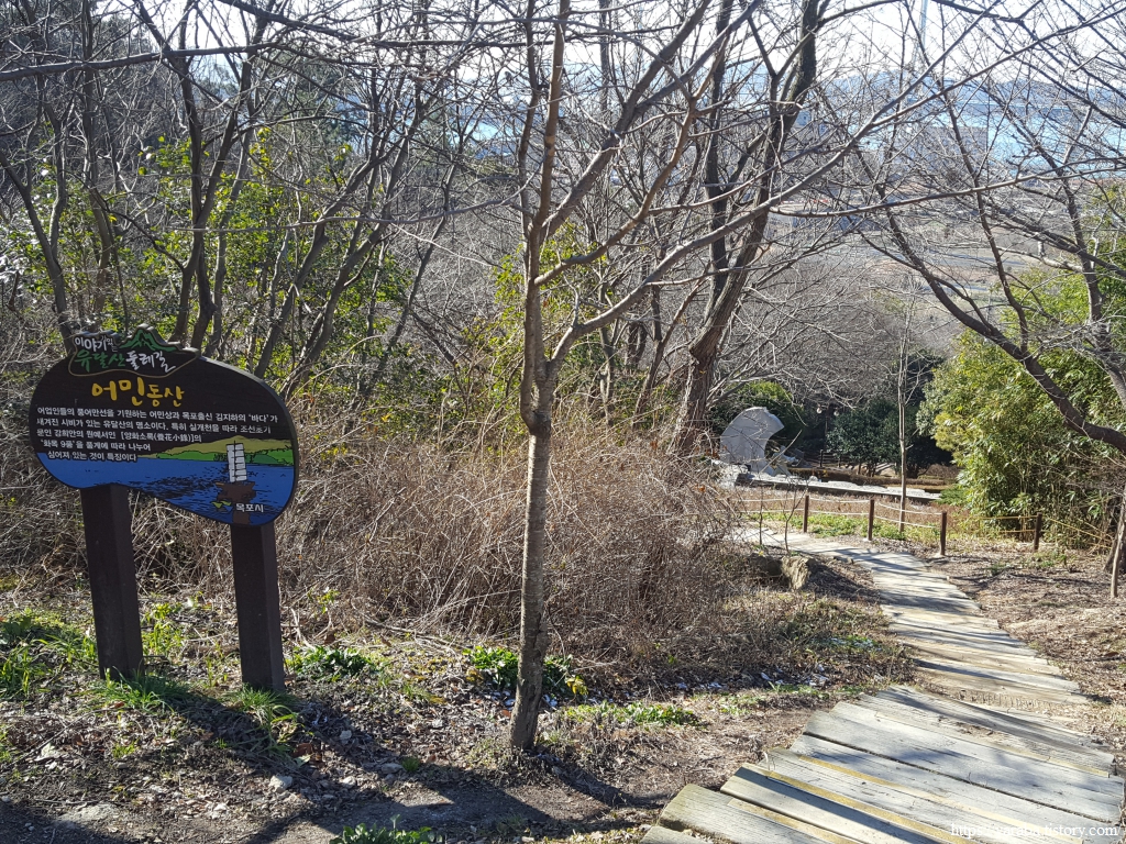 낙조대를 지난 길은 해양대학교 표식을 따라서 계속 유달산 둘레길과 함께한다. 1월의 차가운 날씨에도 햇살이 비추이는 남향의 유달산 둘레길 숲 속 산책로는 포근한 느낌이다.
