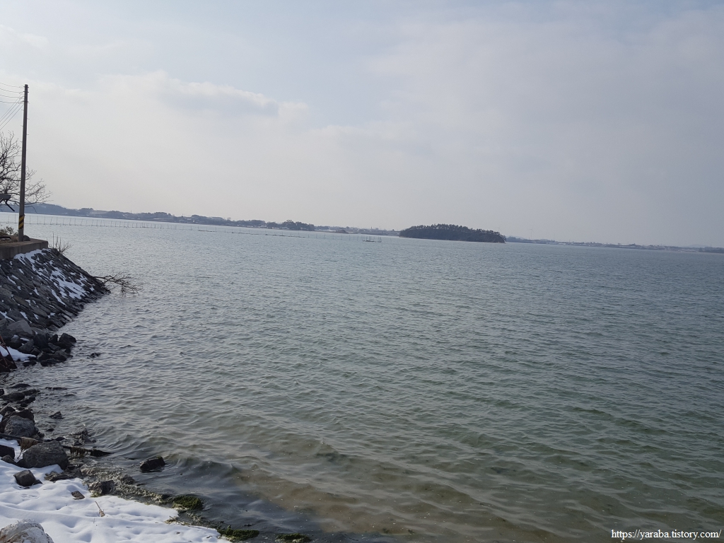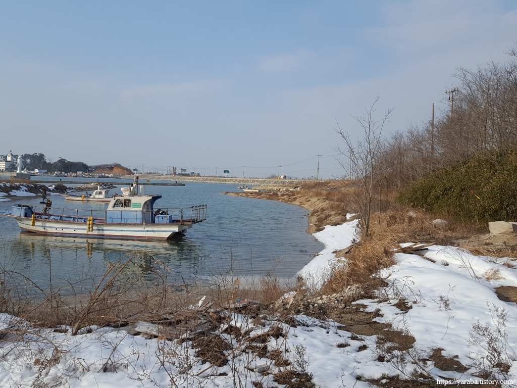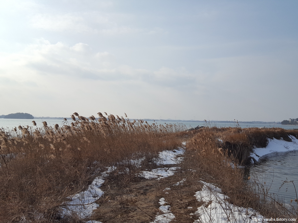 조용한 포구에 지난가을의 흔적을 붙들고 있는 갈대와 아직 녹지 않은 눈이 어우러져 훌륭한 풍경화 한폭을 빚어낸다.