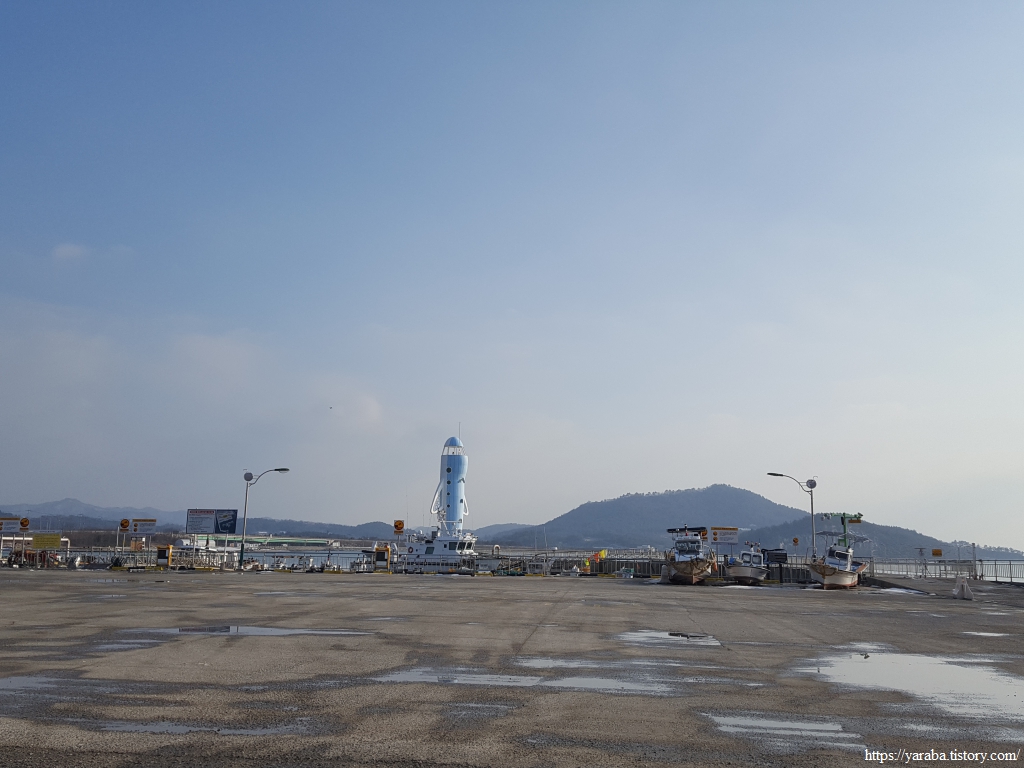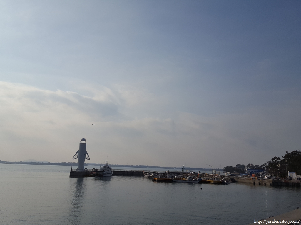 드디어 비행기 모양의 등대가 인상적인 톱머리항에 도착했다. 관광객이 많이 오는 곳이라서 그런지 어항이지만 깨끗한 공중 화장실도 있었다. 비행기 모양의 등대라고들 하는데 보기에 따라서는 날치 모양해도 될법하다.