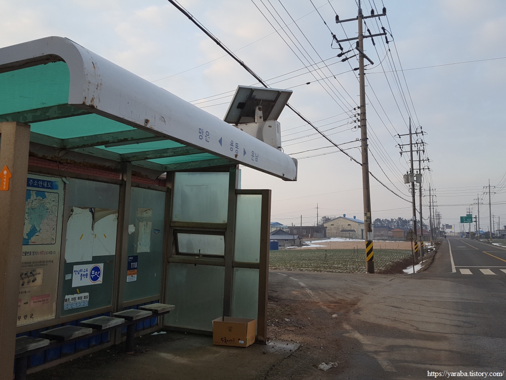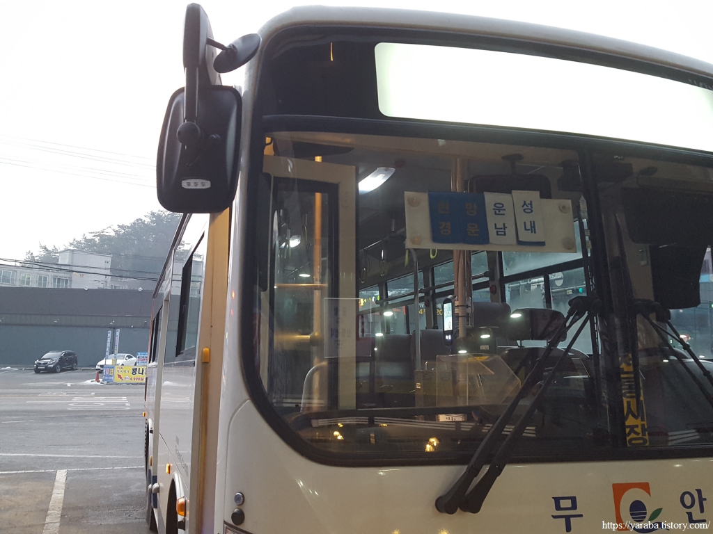 다음날 아침 운남으로 향하는 버스를 타고 두모마을로 돌아와서 어제의 여정을 이어간다. 무안군 홈페이지에 있는 시간표 대로 정확하게 운행하고 있었다. 정류장 안내 방송이 없는 게 흠이지만, 초행자도 맵에 미리 하차 장소를 표시해 두었다가 근처다 싶으면 정차 버튼을 눌러 하차하면 문제 될 것이 없다.