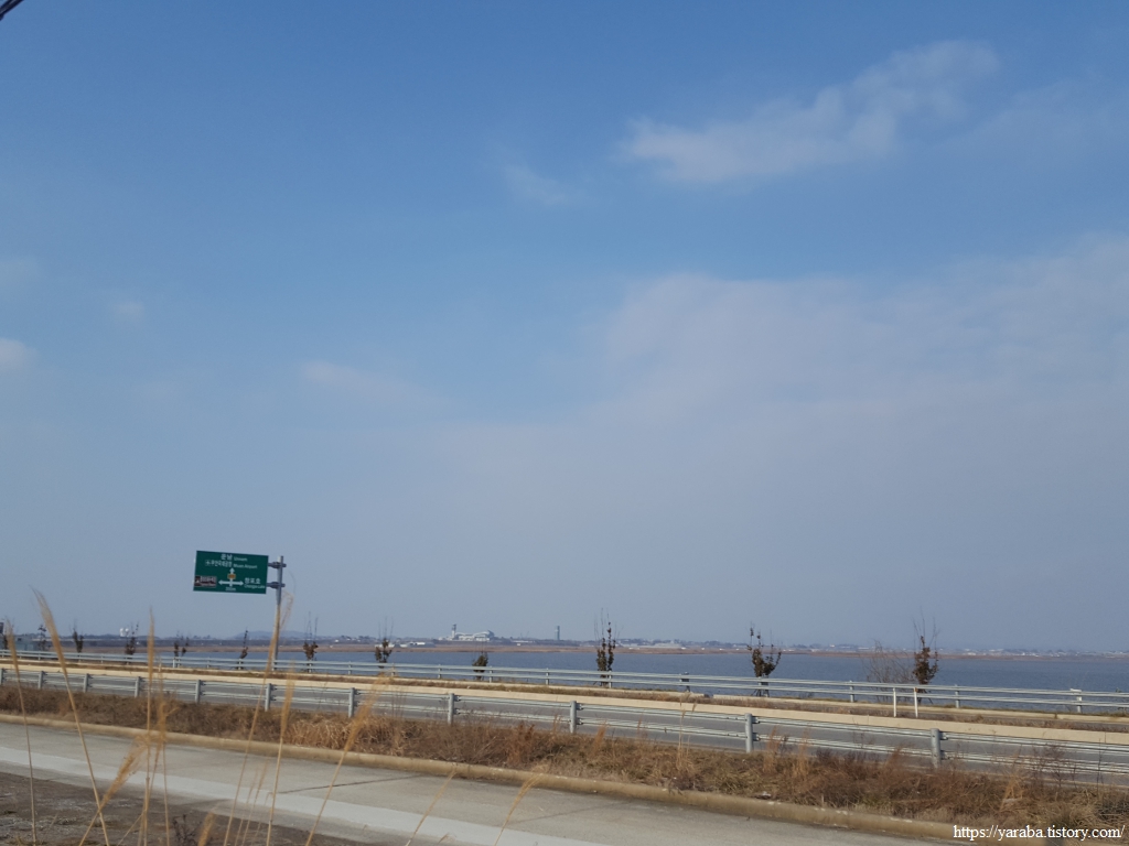 창포 방조제 위로는 청계공항로가 무안 공항으로 이어지고 도로 건너편으로는 방조제가 만든 거대한 창포호가 자리하고 있다. 유당호라고 부르는 사람이 있지만 유당은 개인의 호라고 한다. 무안공항도 보이기 시작한다.