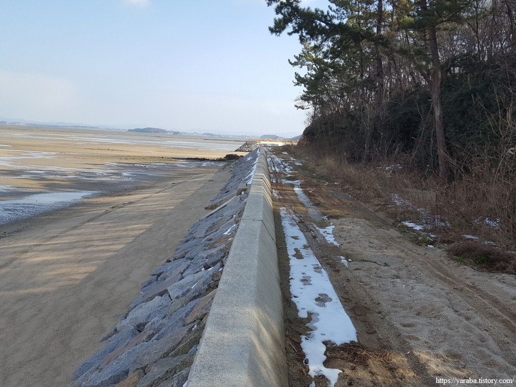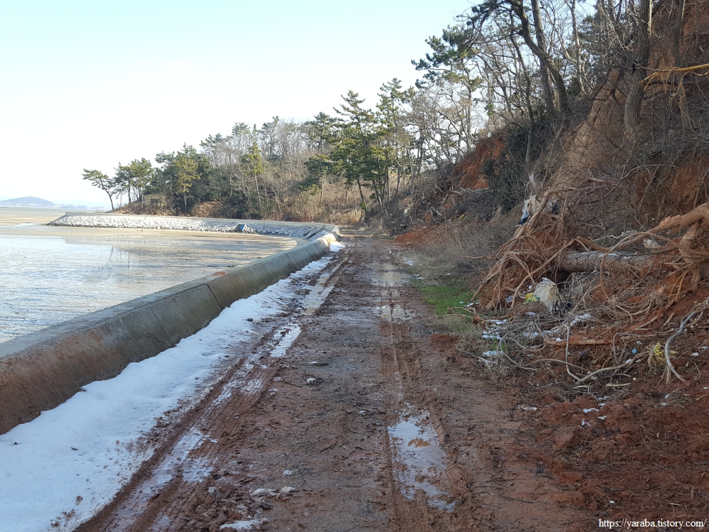 조용한 해안 산책길을 걷는 것은 좋은데, 녹지 않은 눈과 질퍽한 흙탕길을 만났다.