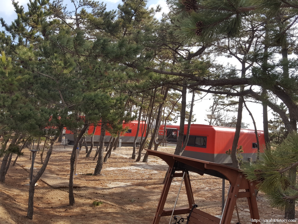소나무 숲을 사이에 두고 해안으로는 고운 모래사장이 안쪽으로는 캠핑장이다.