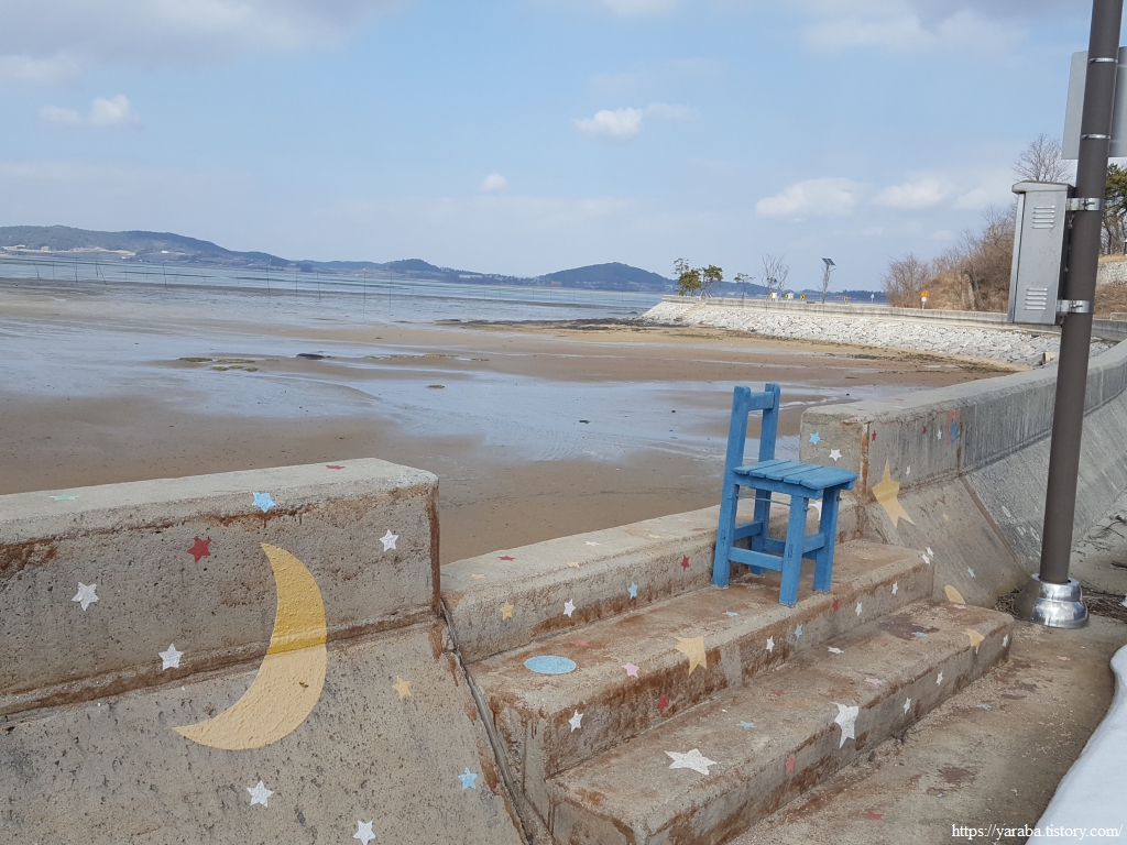 망운면 끝자락 외덕마을 앞의 해안으로는 작은 포토존과 쉼터를 만들어 놓았다. 아마도 저녁에 벤치에 앉아서 석양을 감상하라는 배려인 모양이다.