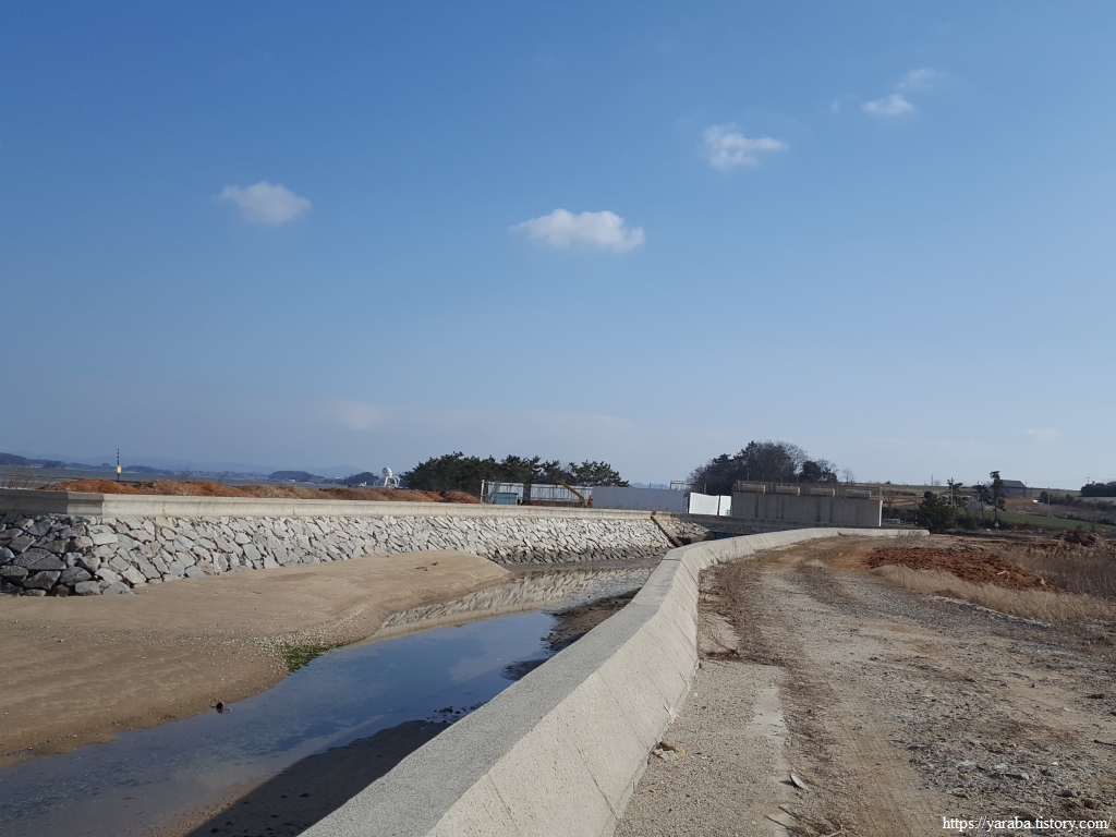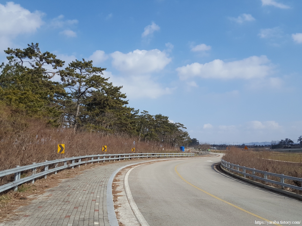 멀리 외덕마을 앞의 작은 숲 언덕을 향해서 길을 이어간다. 바람이 세차게 불어서 모자를 단단히 붙잡고 걸어야 하지만 하늘 그림에서는 바람 흔적이 없다.