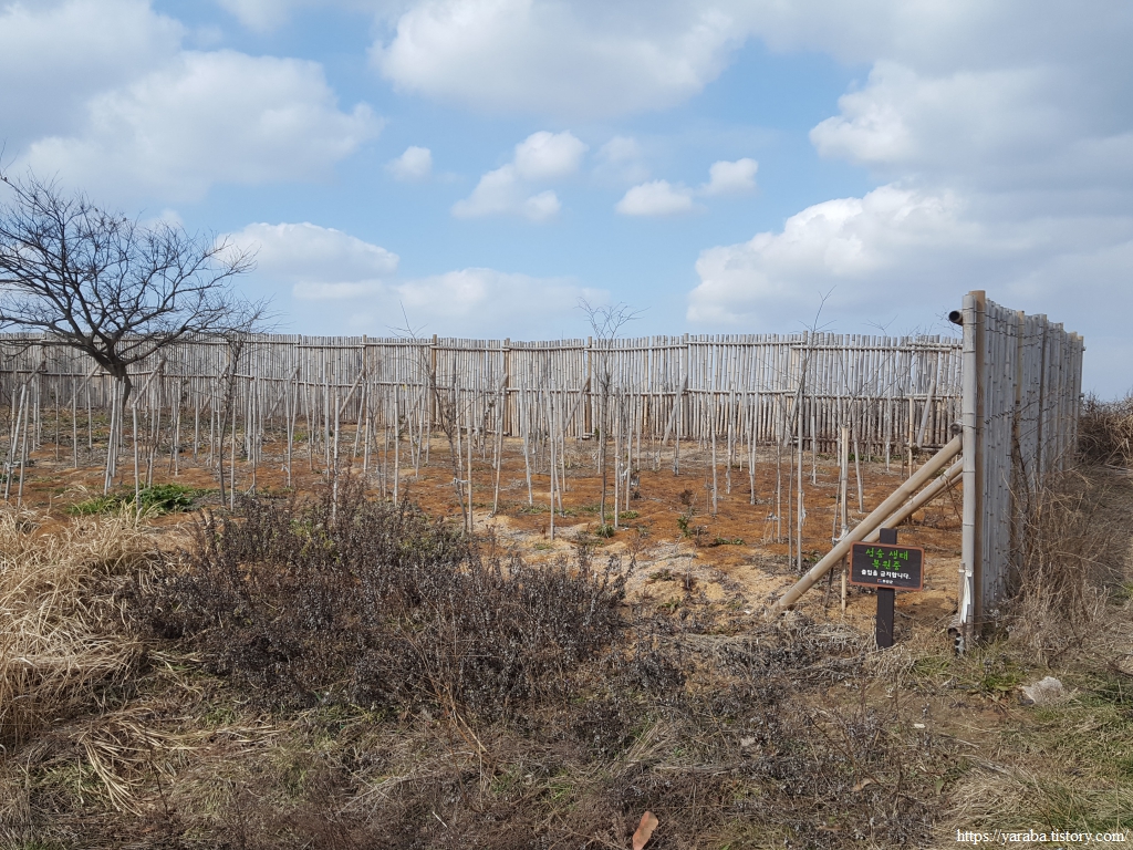 "섬숲 생태 복원 중"이라는 팻말을 보니 묘목들의 정체를 알 수 있다. 서남해안 주변 지역의 섬숲을 되살리기 위한 사업이라고 한다. 기존 숲을 솎아베기 해서 기후 변화에 잘 적응할 수 있는 수종을 심는다고 한다.