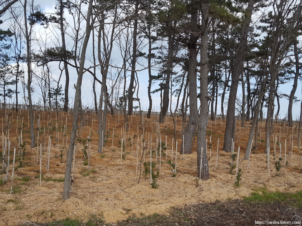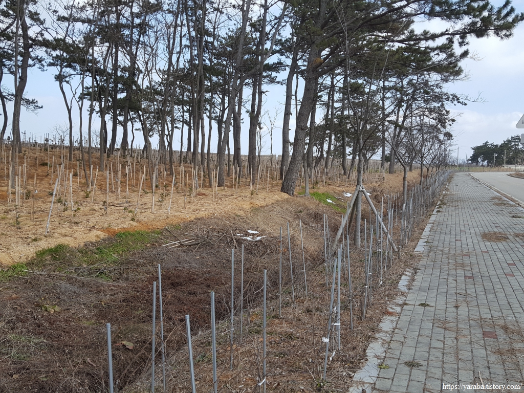 해안 둑방에는 지나친 것 아니야? 하는 의문이 들 정도로 많은 묘목들이 미래를 준비하고 있다. 어찌 되었던 나무 심기는 권장할 일이다. 나무 심기는 미래 세대가 누릴 수 있는 최고의 투자다.