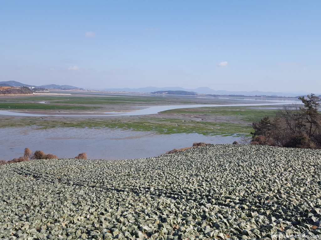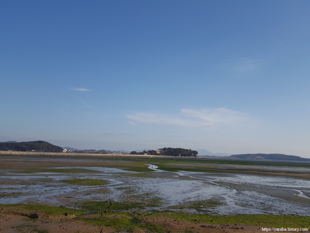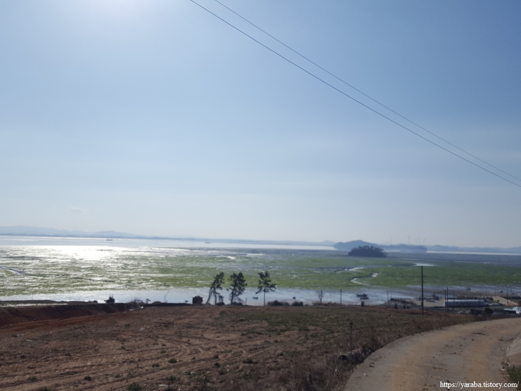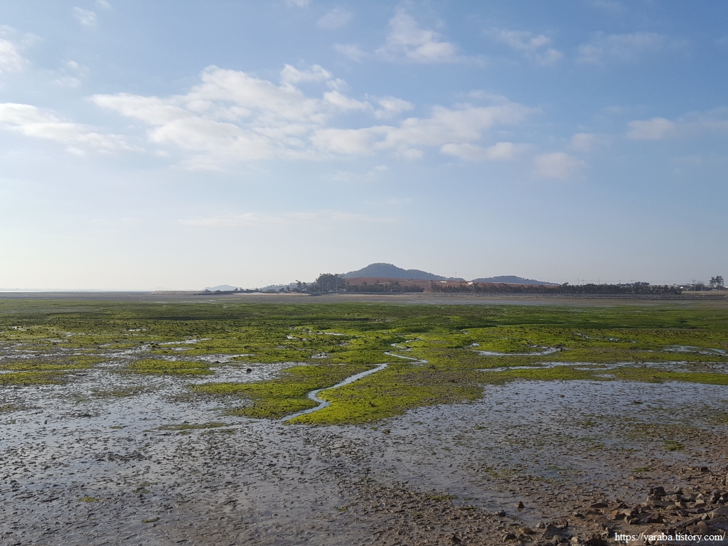 갯벌 위를 푸른 감태가 가득 덮었다. 마치 잔디밭이라 해도 무방하지 않을까 싶다. 멀리 남쪽으로 24코스의 종점이 있는 중매산도 시야에 들어온다.