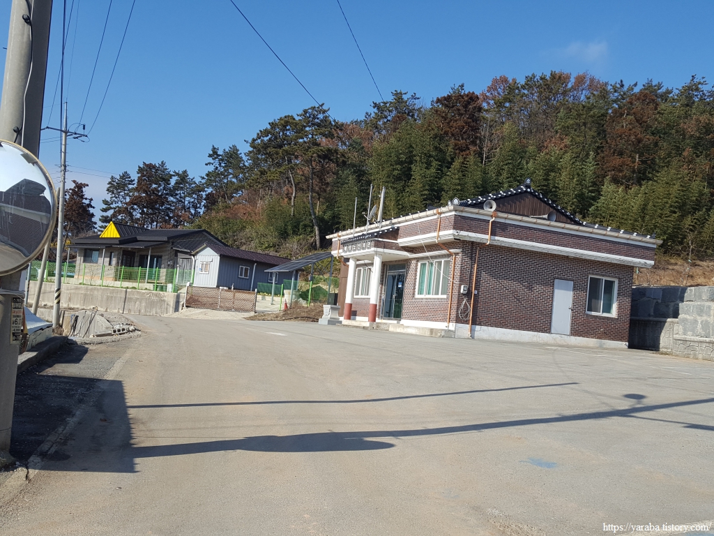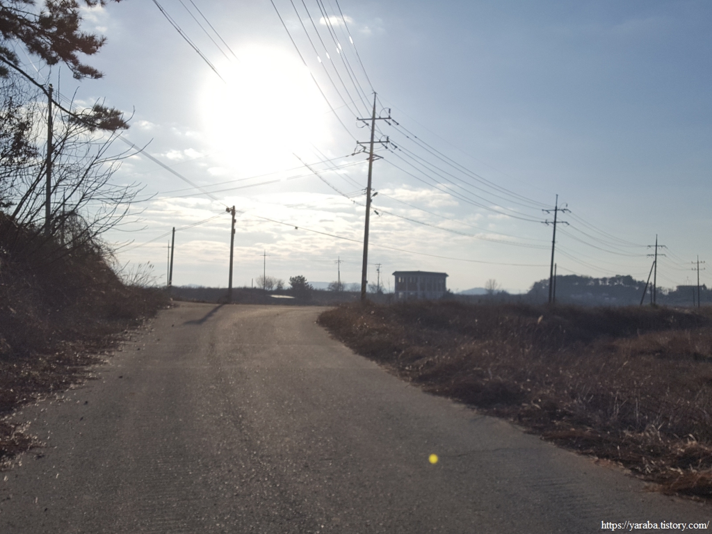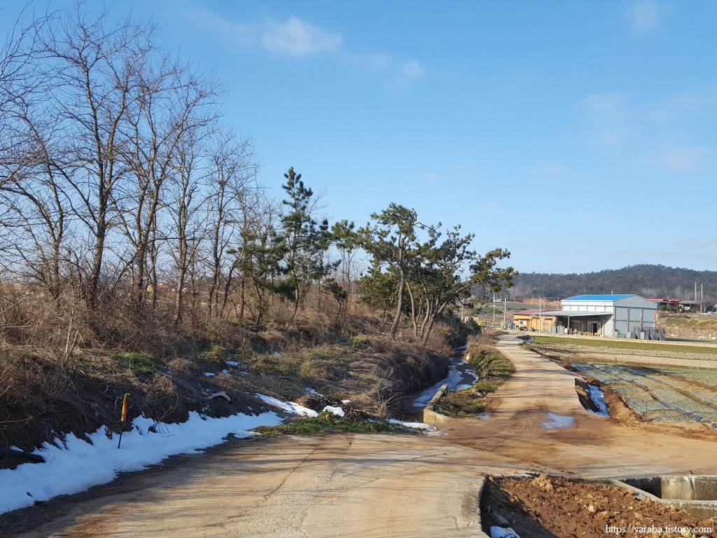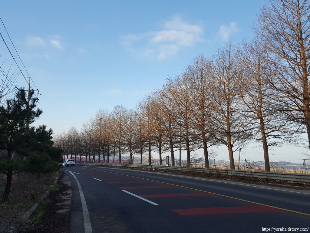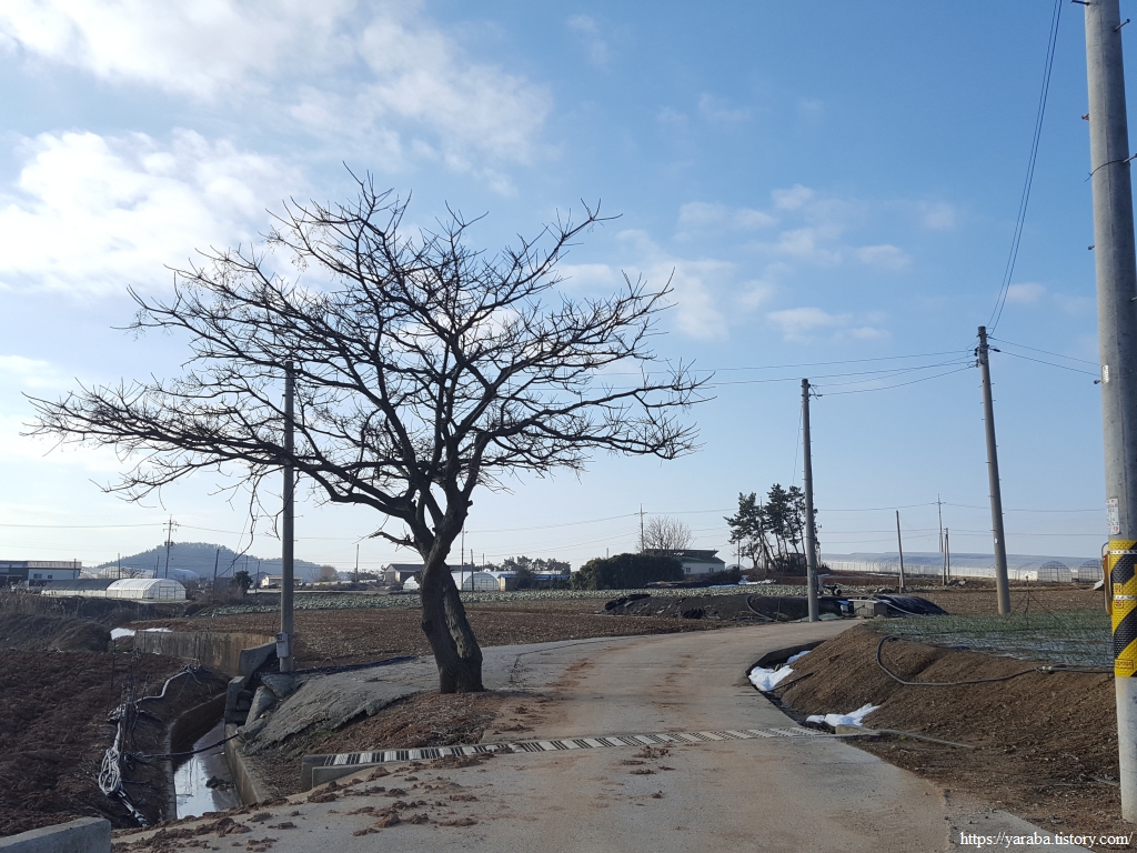 무암마을에서 해제지도로 도로로 다시 나온 길은 도로를 따라서 서쪽으로 이동한다. 평일 이른 아침이라 그런지 자동차가 많지 않다. 지금은 앙상한 가지만 남아 있는 겨울이지만 움이 돋고 잎이 무성한 계절이 오면 가로수가 일품이 길이겠다 싶다.