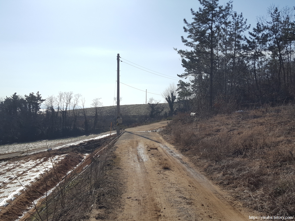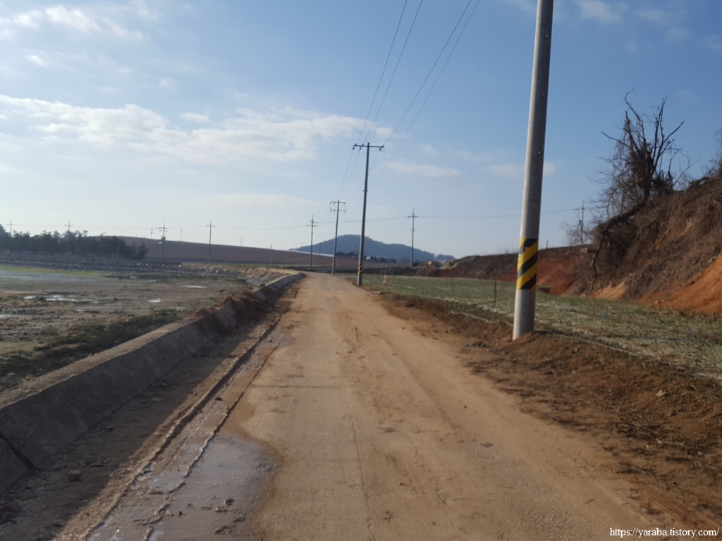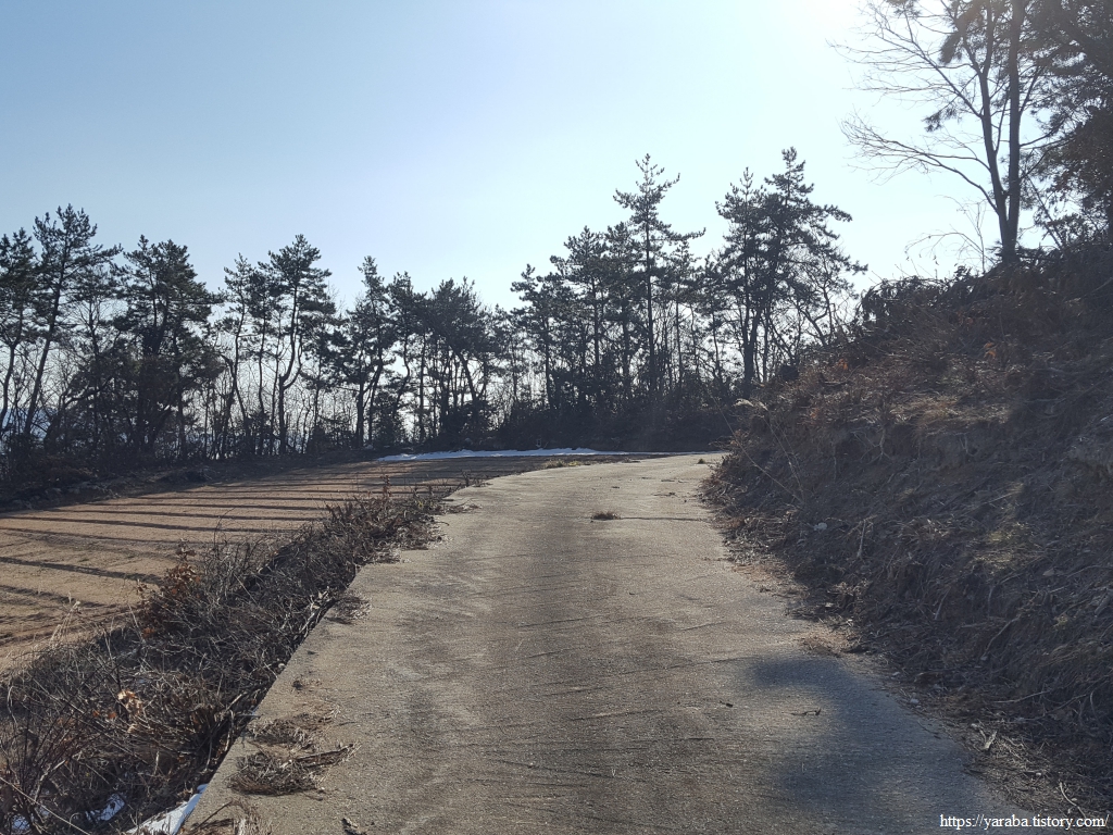 중매산을 좌측으로 돌아가는 길은 산 중턱의 농로를 가로지르는 길이다.