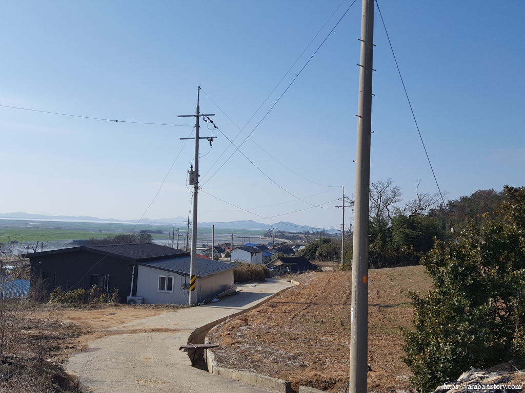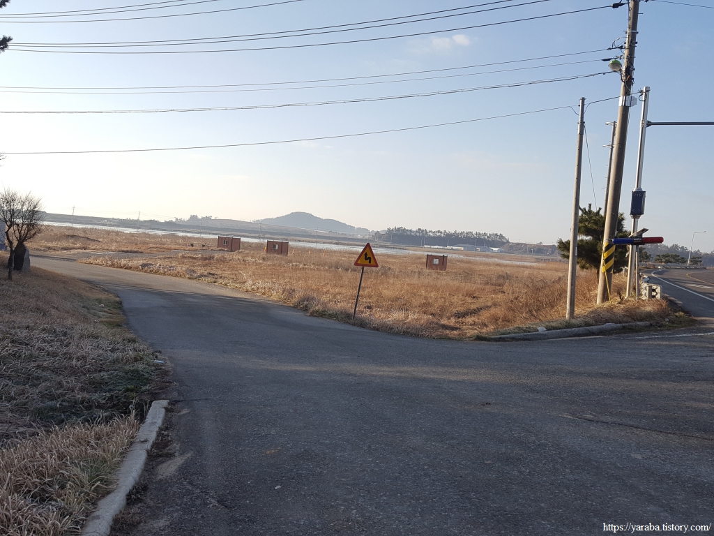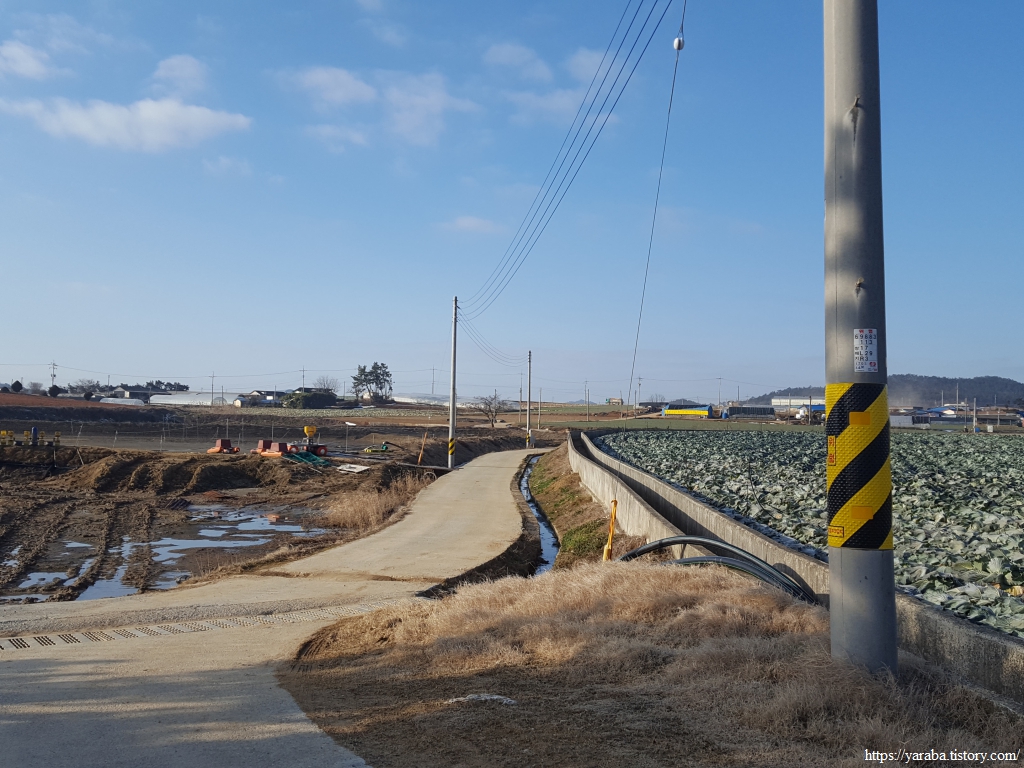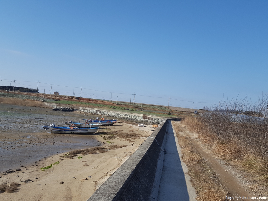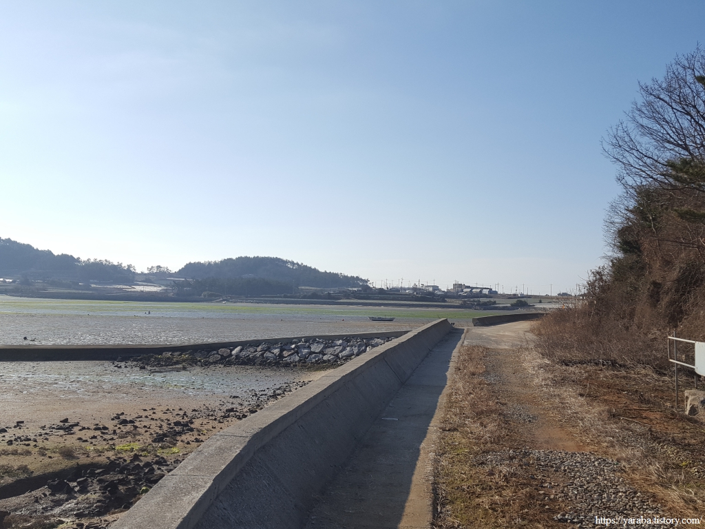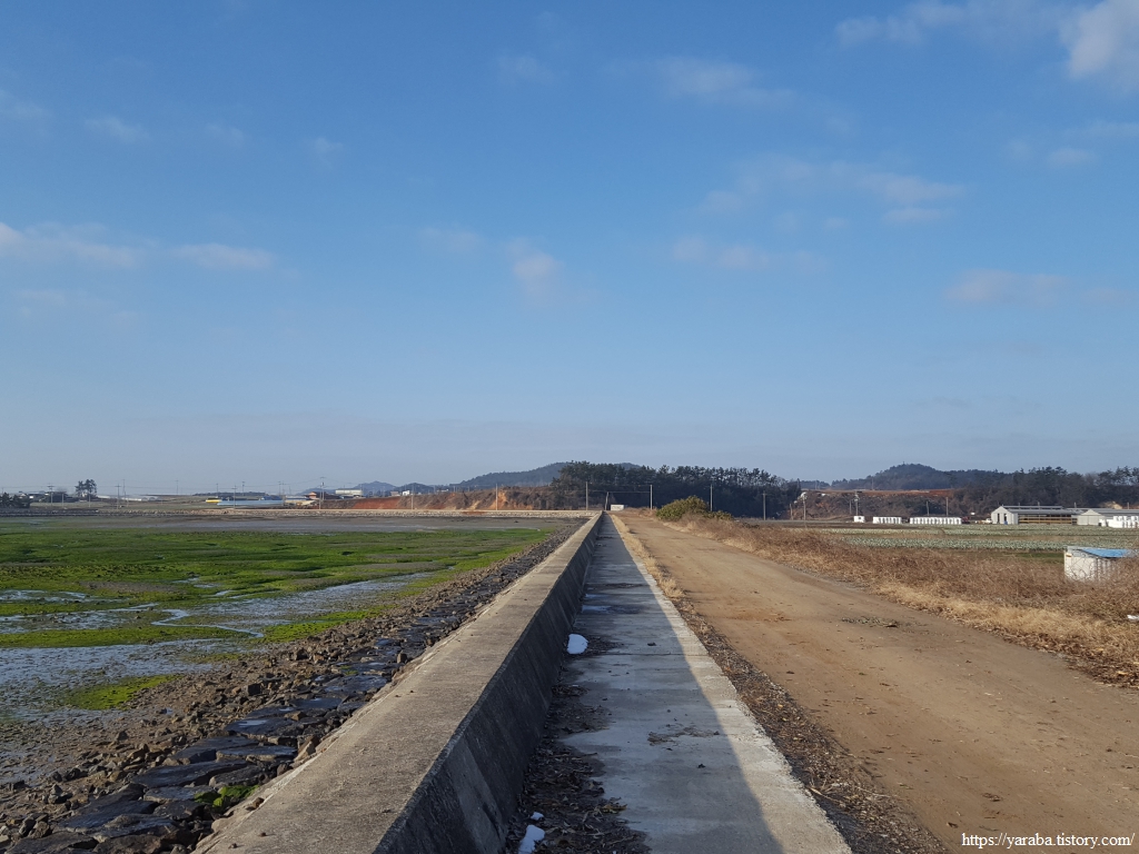 해안 둑방길 안쪽 농로를 따라서 길을 이어간다. 그늘진 곳에는 아직도 눈이 녹지 않았다. 그만큼 날씨는 화창하지만 손이 시려서 스틱을 양손으로 번갈아 잡으며 손을 녹여 주어야 했다.
