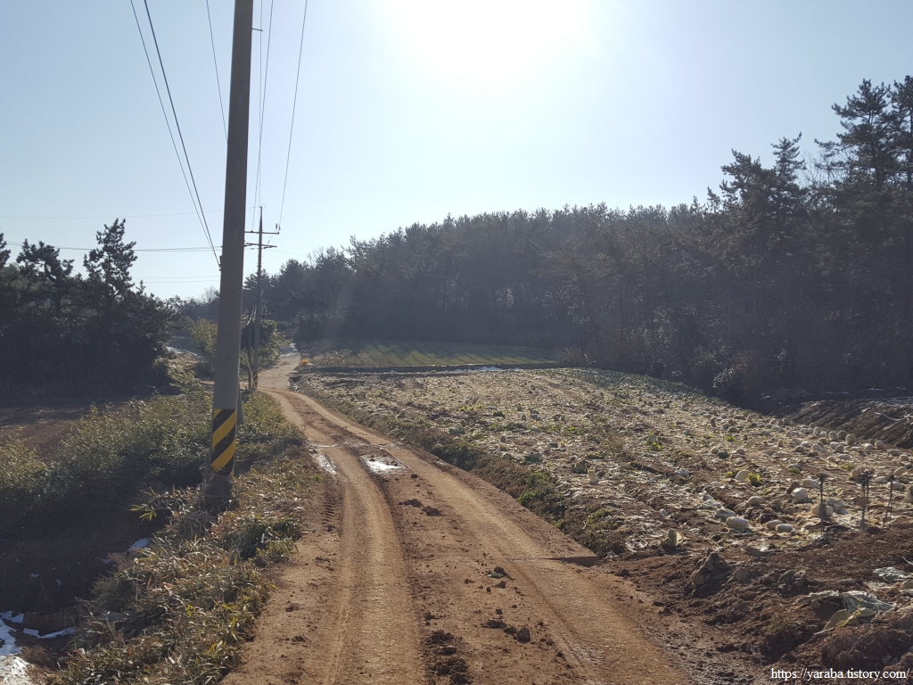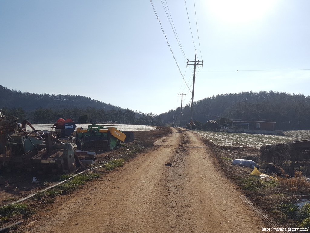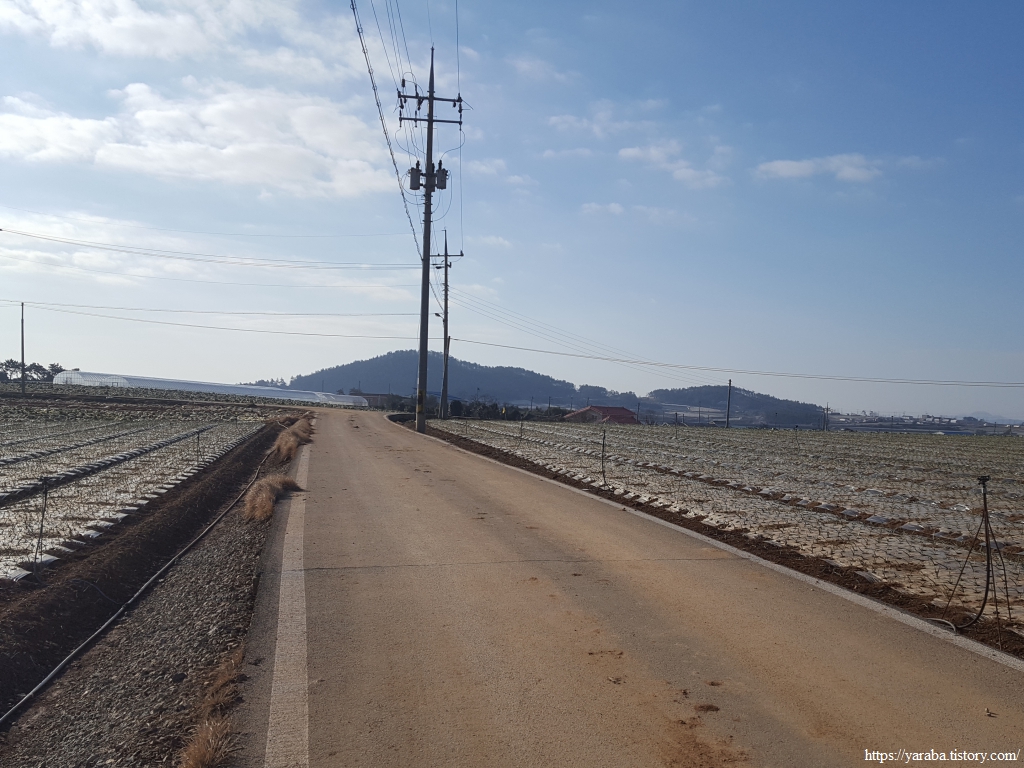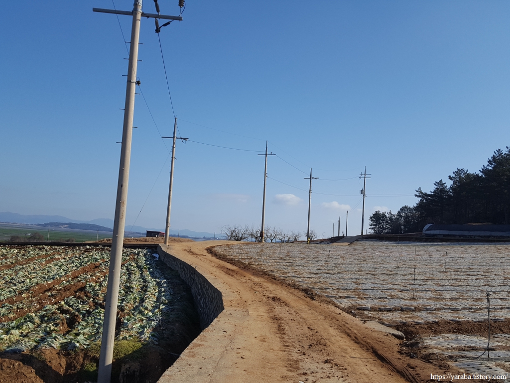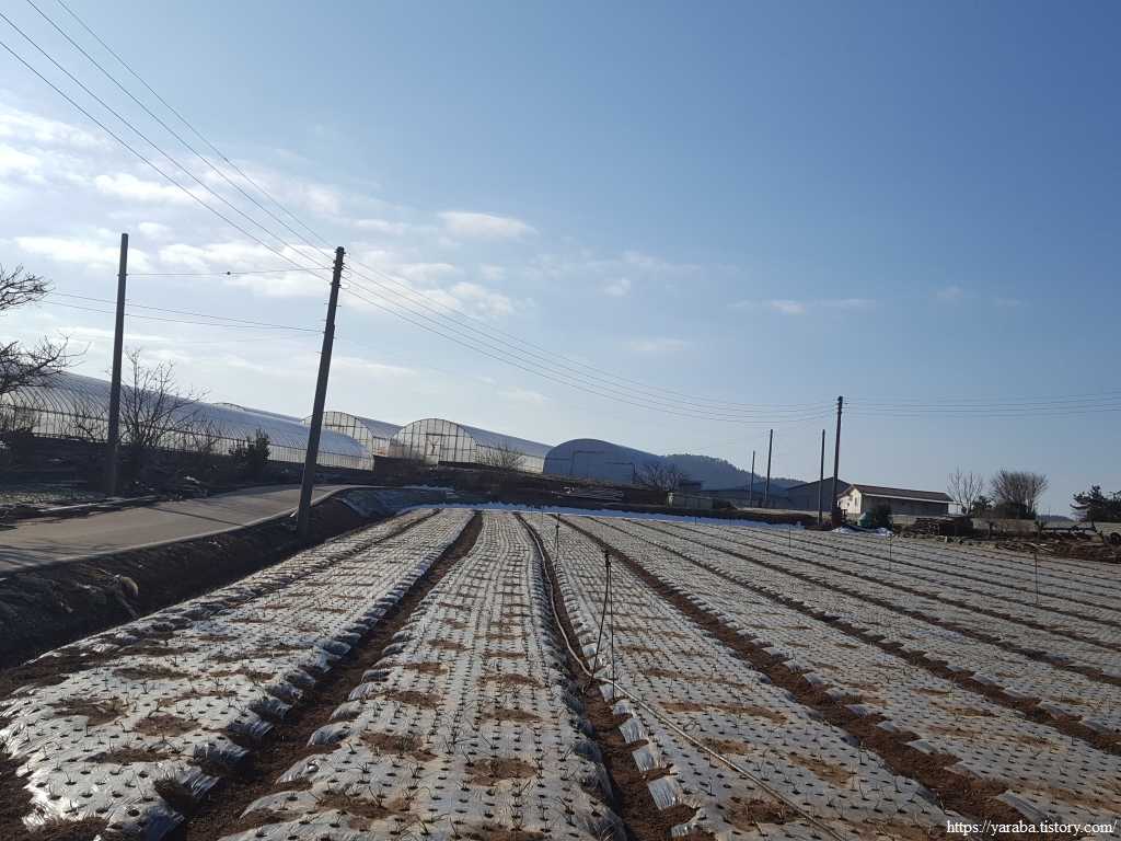 밭 사이로 지나는 농로 좌우로는 검은 비닐을 둘러쓴 양파밭이 봄을 기다리고 있다.