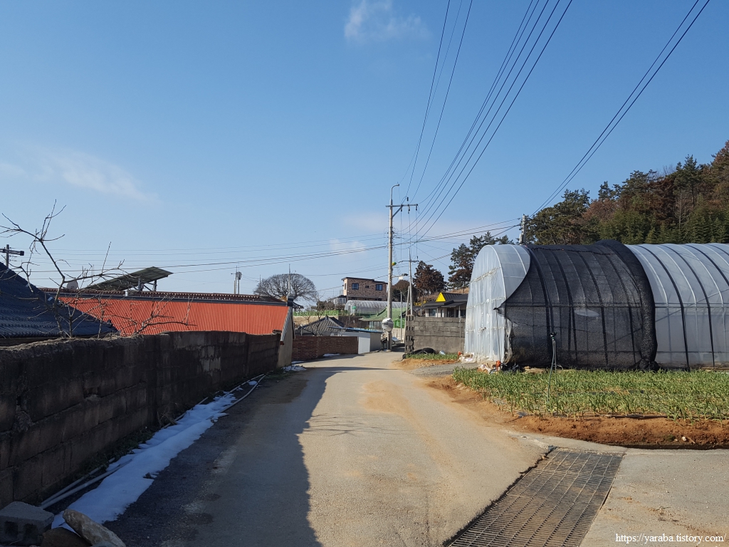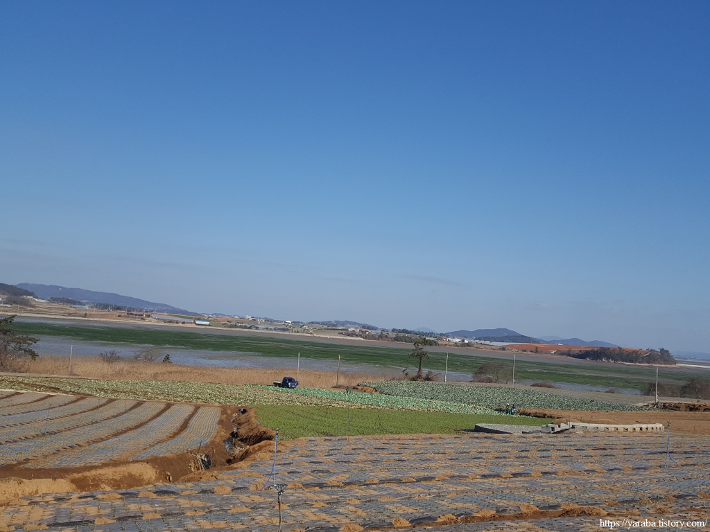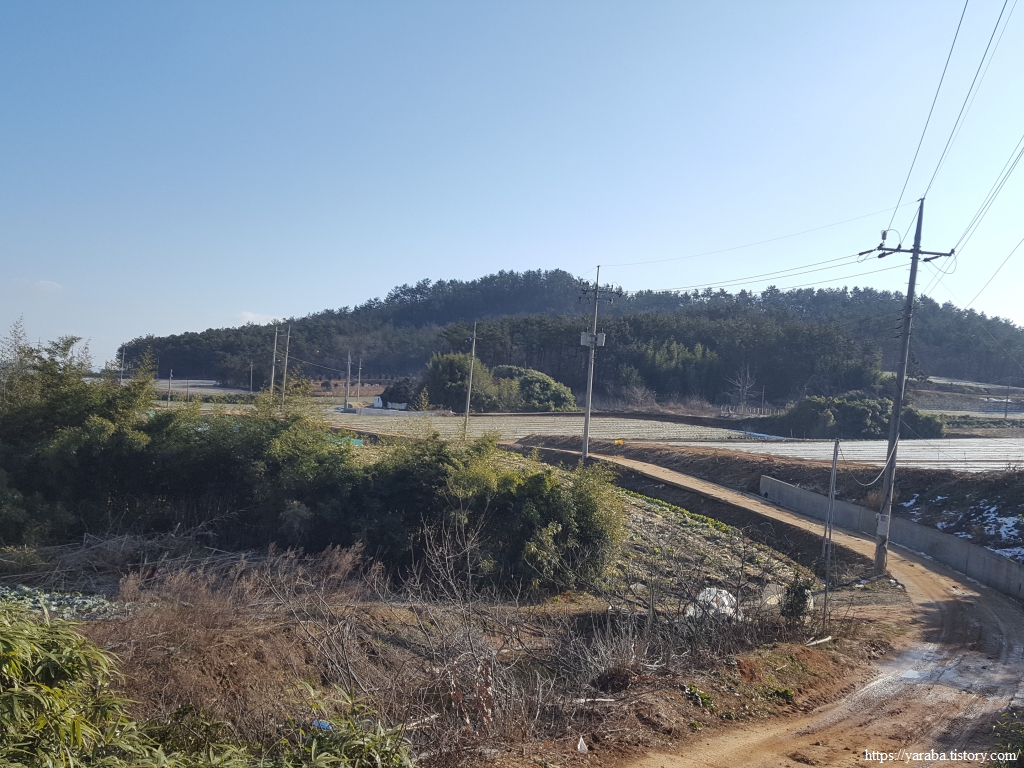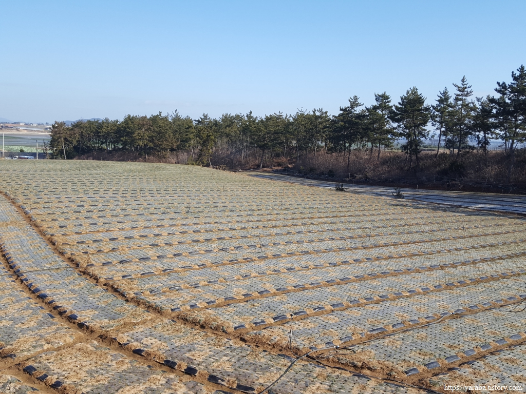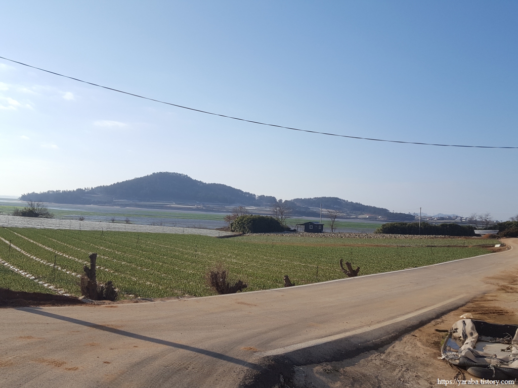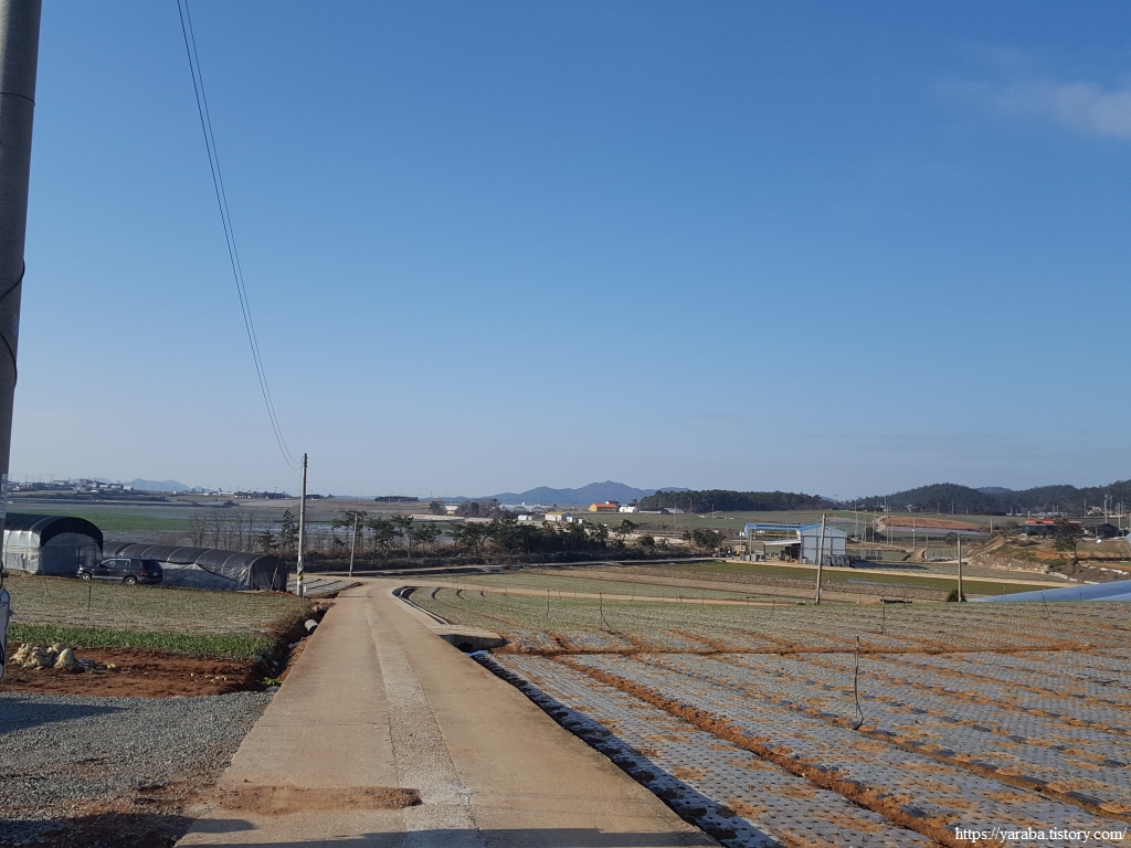 밭 사이로 지나는 농로 좌우로는 검은 비닐을 둘러쓴 양파밭이 봄을 기다리고 있다.