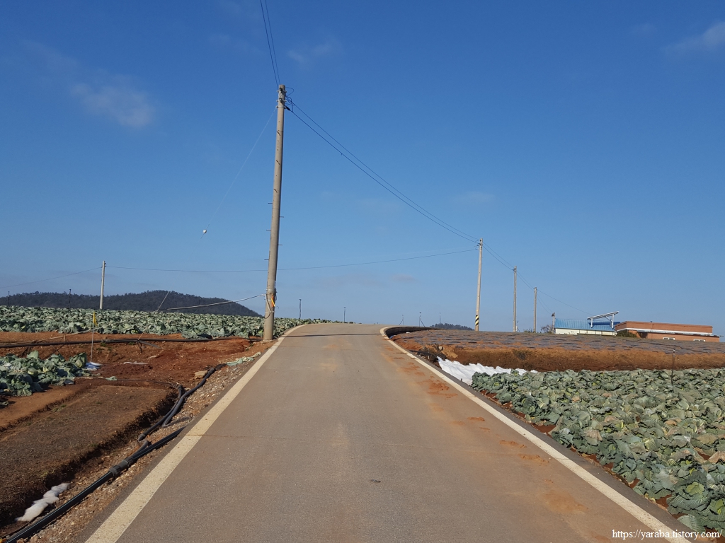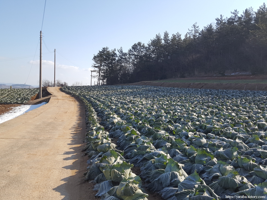 창매마을로 가는 도로에서는 수확한 양배추를 차에 싣느라 여념이 없었다. 창매마을을 지나면 길은 다시 도로를 벗어나 중매산을 좌측으로 돌아서 간다.