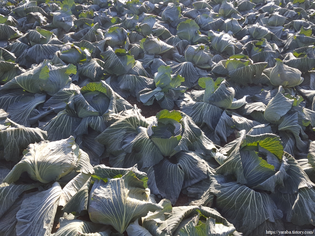 가을에 뿌리를 내리고 새로운 성장을 기다리고 있는 양파밭이 있다면 다른 한쪽에서는 통통하게 잘 큰 양배추들이 수확을 기다리고 있다.