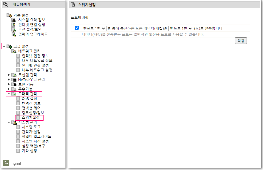 국내 공유기 점유율 1위라는 ipTIME 기준의 설정 방법은 위의 그림처럼 일단 공유기 관리자 페이지를 들어가서 고급설정> 트래픽관리> 스위치설정에서 작업을 진행할 수 있다.