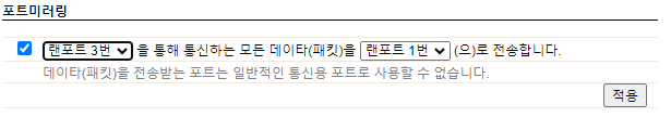 필자의 의도대로 설정하기 위해서는 맨 앞의 체크박스를 체크하고 첫 번째 콤보박스에서 랜포트 3번을 선택하고 두 번째 콤보박스에서 랜포트 1번을 선택한 다음 [적용]을 누른다.