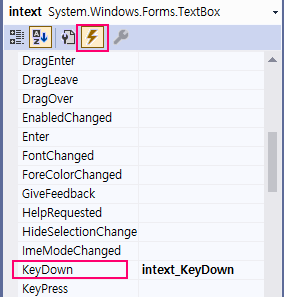 대화창의 디자인 편집기를 열고 텍스트 박스를 선택한 다음 위의 그림과 같이 속성창에서 이벤트 아이콘을 클릭한다. 그리고, "KeyDown" 이벤트를 찾아 우측 공간에 더블클릭하여 자동으로 코드를 만들고 다음과 같이 코드를 작성하면 된다.