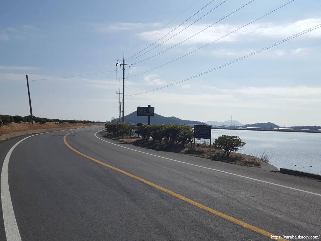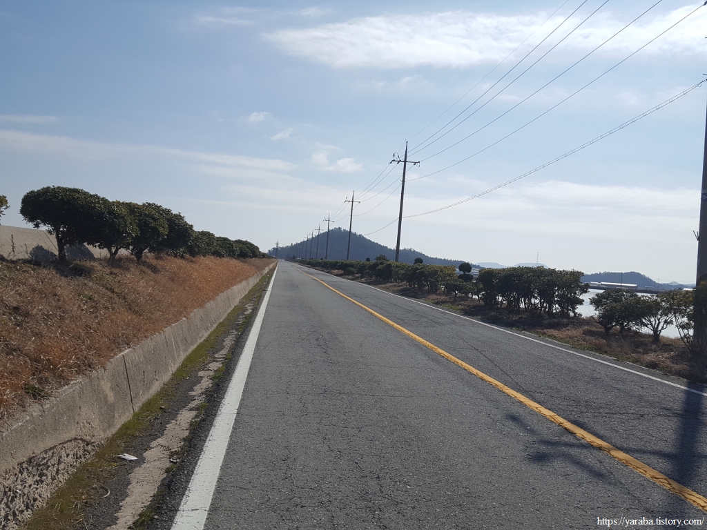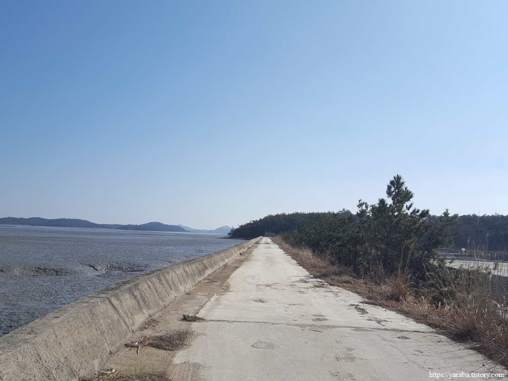 북쪽의 증도대교를 뒤로하고 증도 남쪽으로 방향을 잡고 방조제 길을 따라 내려간다. 원래는 두 개의 섬이었던 증도를 하나로 연결한 방조제이다.