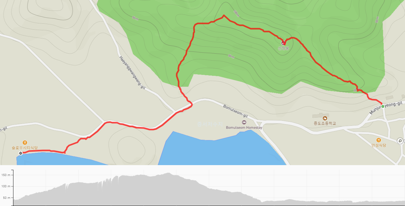 서해랑길 27코스에 이어서 걷는 28코스는 증도면사무소에서 시작한다. 오늘은 펜션에서 하룻밤 묵어가므로 증도 읍내에서 필요한 것을 구입해서 길을 시작한다. 상정봉(124m)을 넘어서 증서저수지 쪽으로 내려가 오산마을에 이른다.