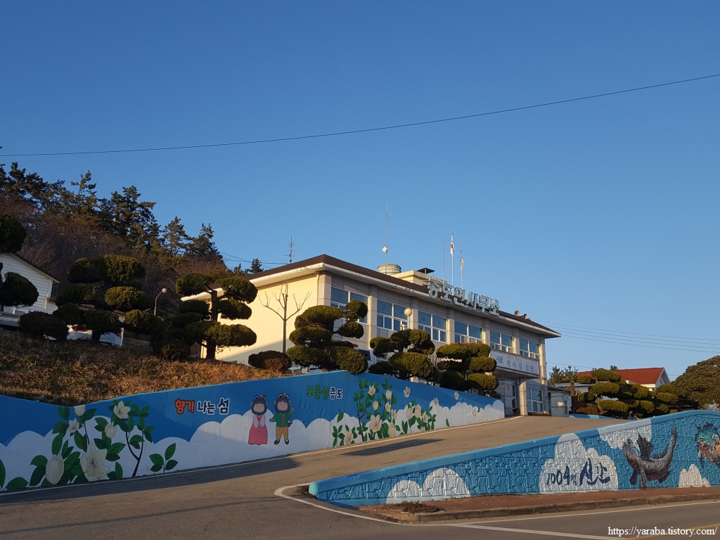 오후 5시 40분을 바라보는 시간, 서해랑길 28코스를 26코스, 27코스에 이어서 걷다 보니 조금 무리가 되는 것은 사실이다. 그렇지만 동네 뒷산 정도인 상정봉만 넘으면 휴식을 취할 수 있는 숙소에 닿으니 마지막 힘을 내본다. 황금빛 석양이 온 대지를 물들이는 시간이다. "향기 나는 섬, 보물섬 증도, 천사 1004 섬 신안"등의 문구를 벽에 적어 놓은 증도면사무소 입구에서 28코스를 시작한다.