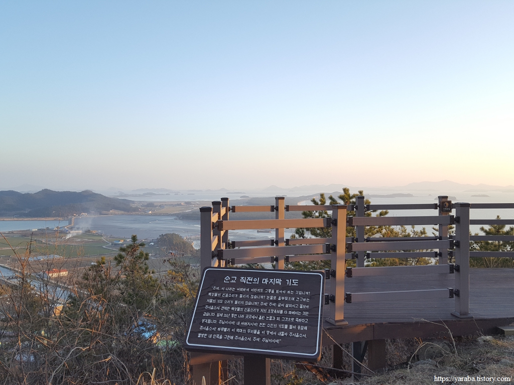 길지 않은 계단 끝에 이르면 환상적인 증도 전경을 감상할 수 있는 전망대를 만날 수 있다. 이름하여 한반도 전망대이다. 문준경 전도사의 순교 직전 마지막 기도라 적힌 팻말이 세워져 있는데 팻말을 읽어보면 일제 강점기와 한국 전쟁을 거치며 겪었을 우리네 민초들의 고통을 조금이나마 미루어 짐작케 한다.
