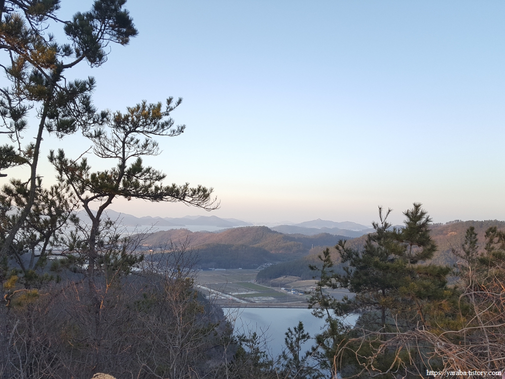 서둘러 정상을 지난 길은 북쪽 염산 마을의 저수지를 뒤로하고 서쪽 능선을 따라 이동한다.