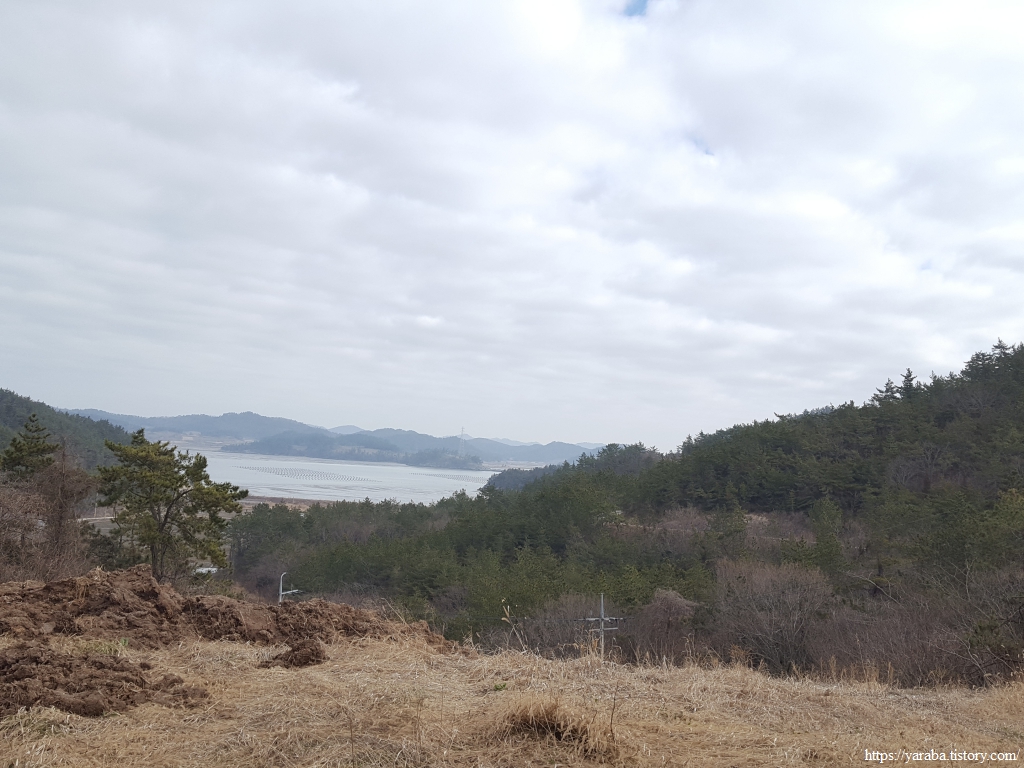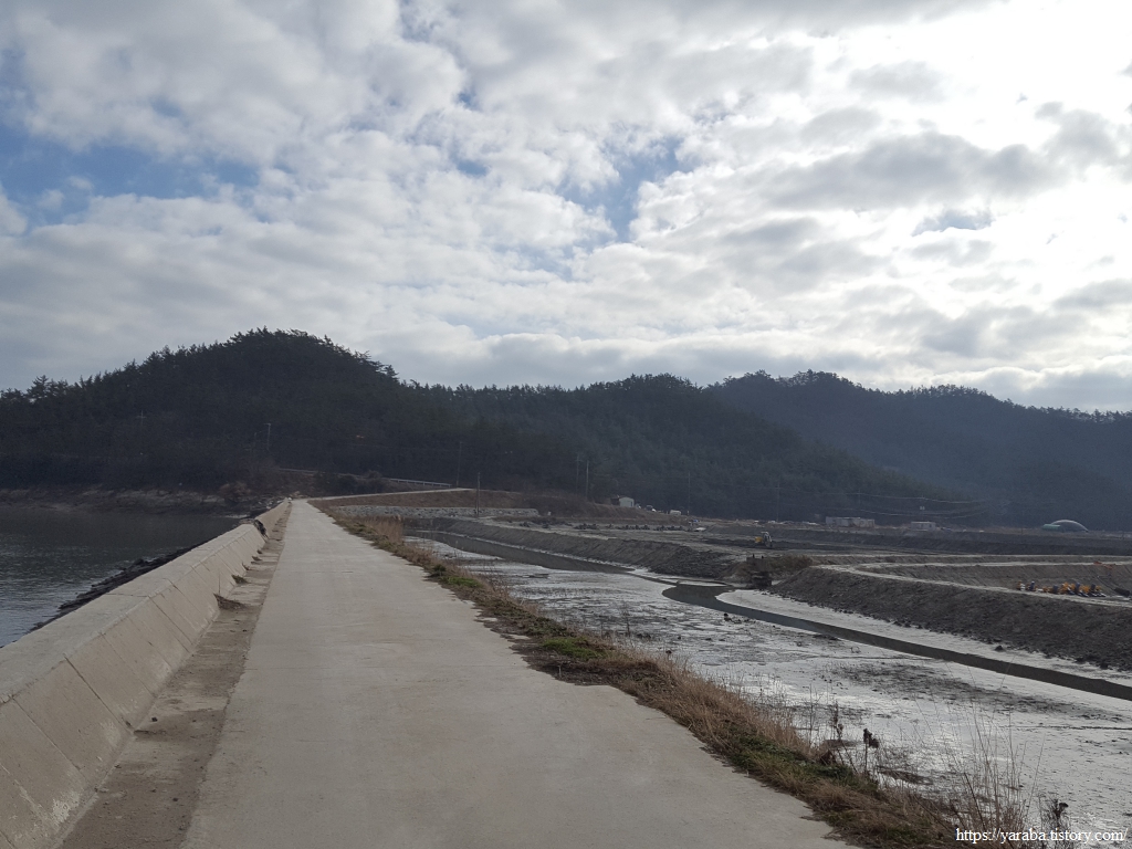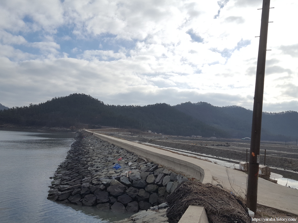 두 산을 연결하는 방조제길을 걸어 염산마을로 향한다. 방조제가 만들어 놓은 공간에는 새우양식장이 자리하고 있는데 겨울이라 지금은 휑한 모습이다. 보통 야외에서는 봄에 키우기 시작해서 8월에서 10월 사이에 출하한다고 한다. 겨울의 새우 양식장에서는 불도저와 포클레인이 다음 양식을 위해서 양식장을 다듬는 작업이 한창이다.