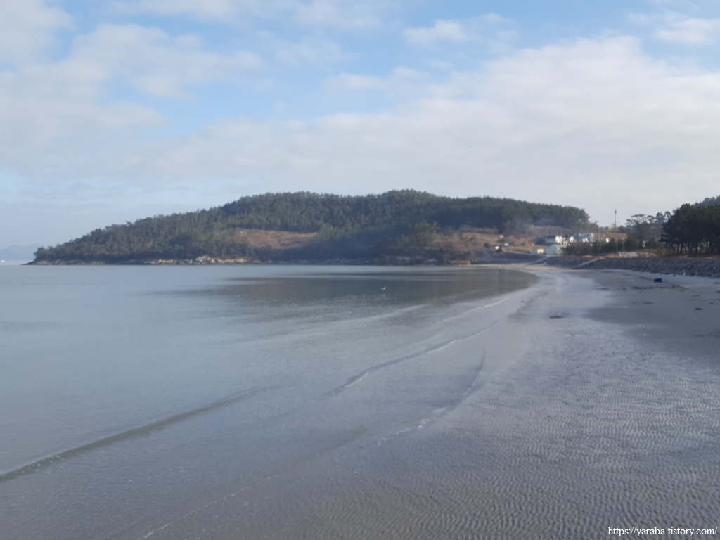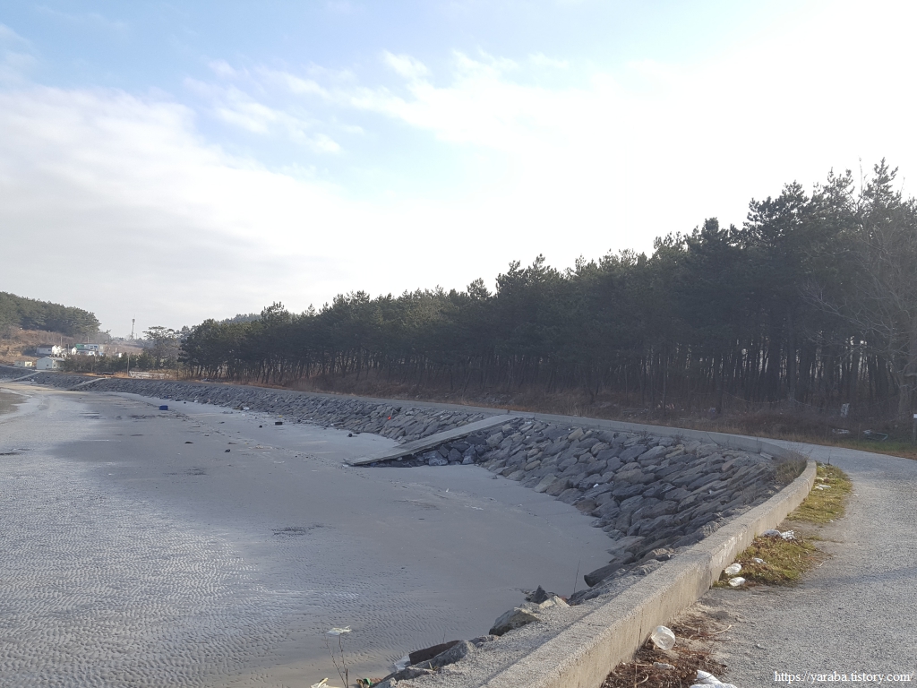 물 빠진 방축마을 해변 끝자락에 앉아서 깨끗한 해안선을 감상하며 잠시 쉬어간다. 해변 뒤로는 소나무 방풍림이 펼쳐져 있어서 물놀이 계절이 되면 사람들이 많이 찾겠구나 하는 생각이 들었다.