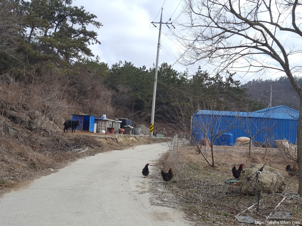 염산마을 앞 들판을 가로지른 길은 한 민가 앞을 지나 돈대봉 임도 오르기를 시작한다. 자유롭게 풀어놓은 닭들이 부럽기도 하고 신기하기도 하다. 고양이에게 해를 받지는 않는지, 닭들이 집을 떠나 도망가지는 않는지, 집에서 닭 몇 마리를 가두어 키우는 입장에서는 정말로 부럽고 신기한 모습이다.