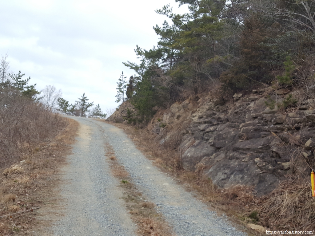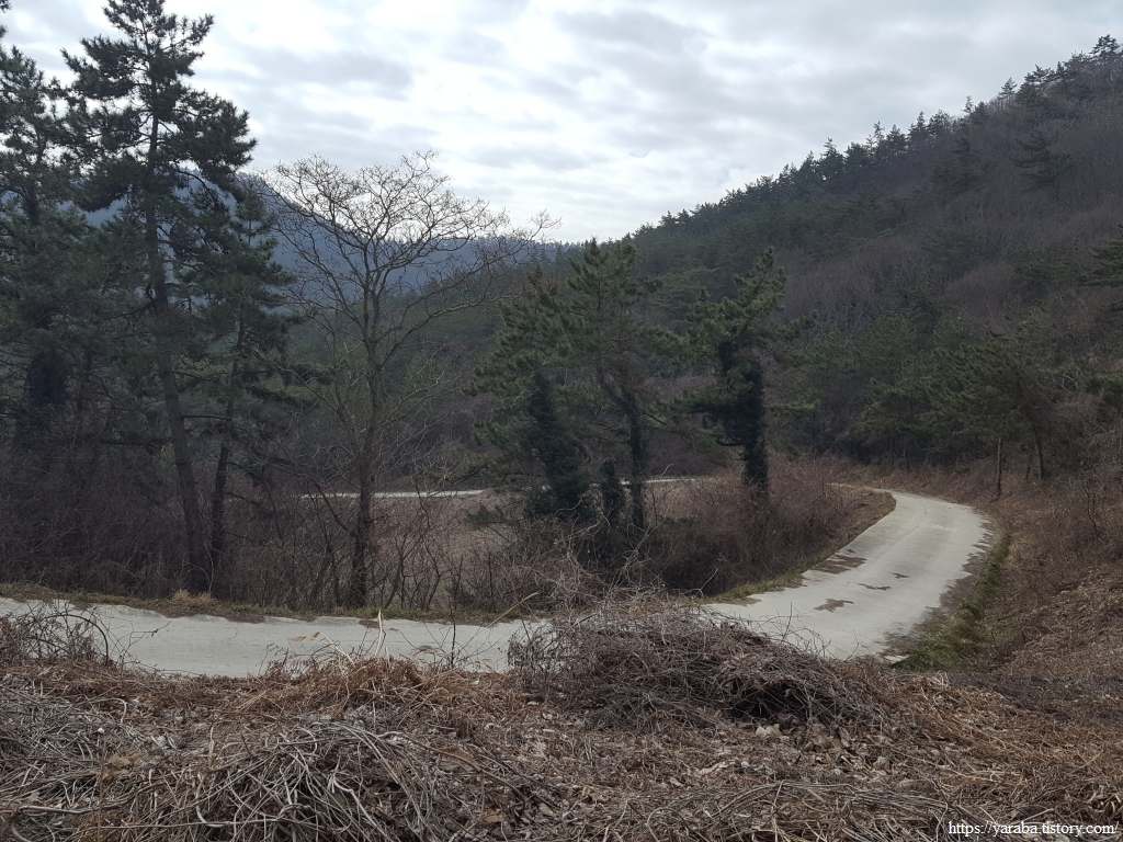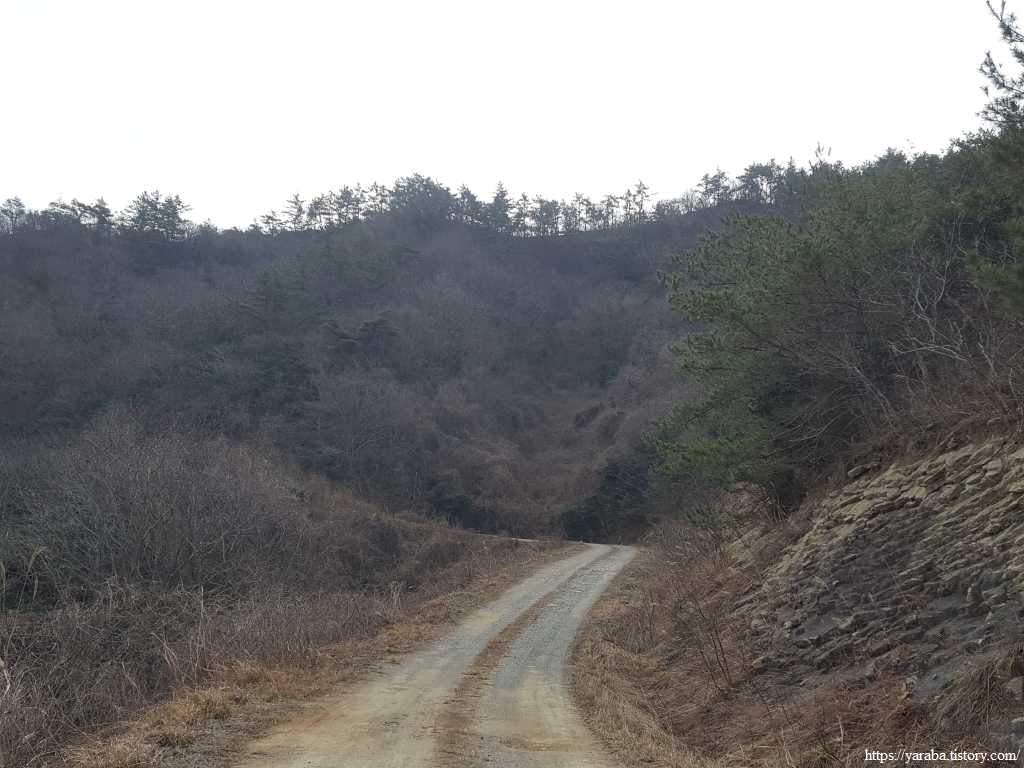 통사골 계곡 아래로 바다를 바라보며 산 능선으로 이어진 임도를 따라 걷는다.