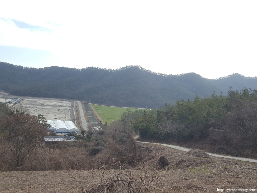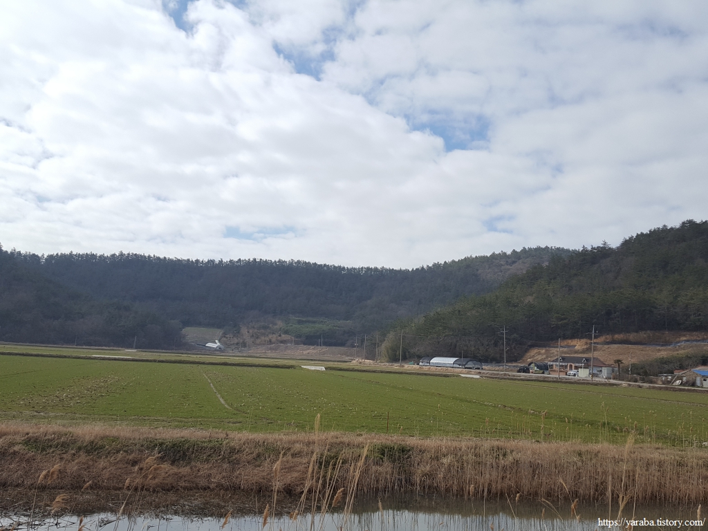 산을 내려가니 논에 보리를 심었는지 푸른 들판이 우리를 반겨준다. 안골 저수지가 있는 곳인데 계곡 위쪽에는 논이 자리하고 있고 아래에는 새우 양식장이 있어서 한창 양식장 다듬기에 여념이 없었다.