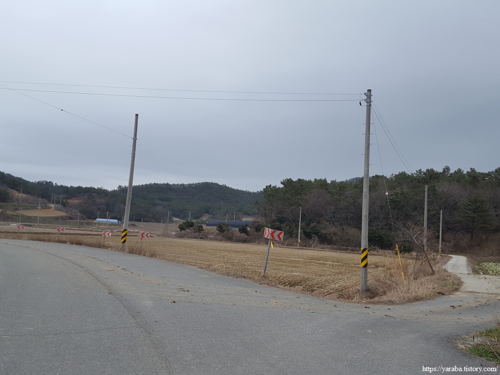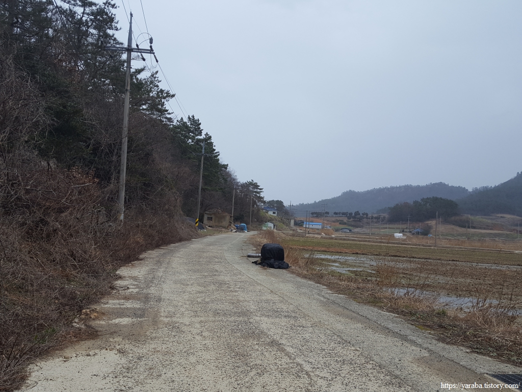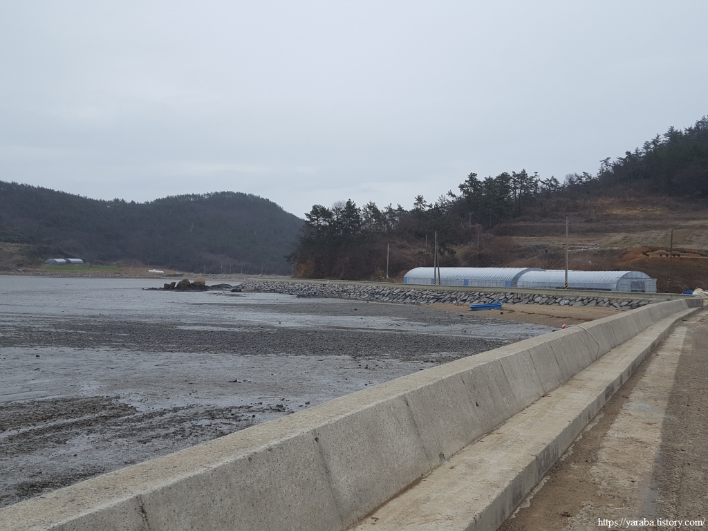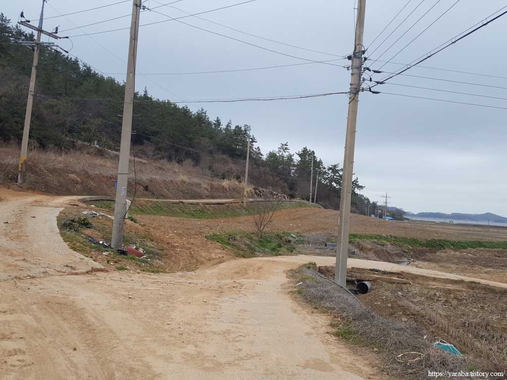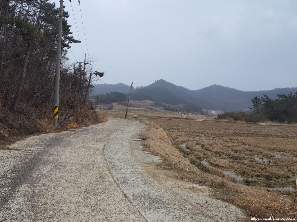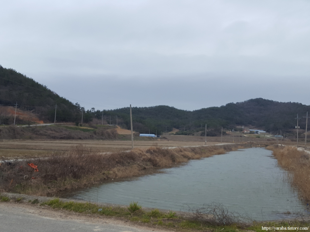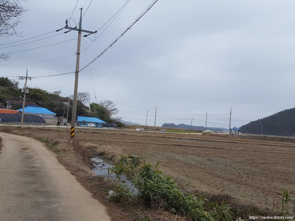 봉리길 도로를 따라서 계곡에서 바다로 이어지는 수로를 건너고 멀리 원래의 서해랑길이 걸을 계곡길을 바라보면서 길을 이어간다.