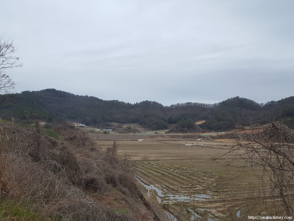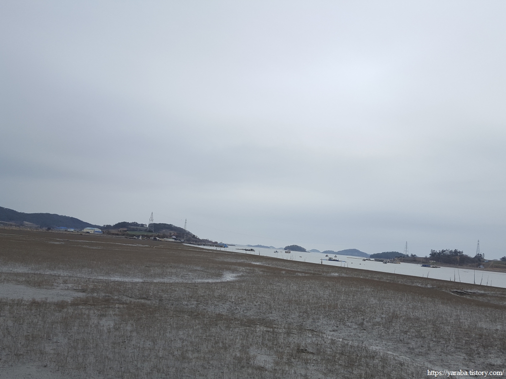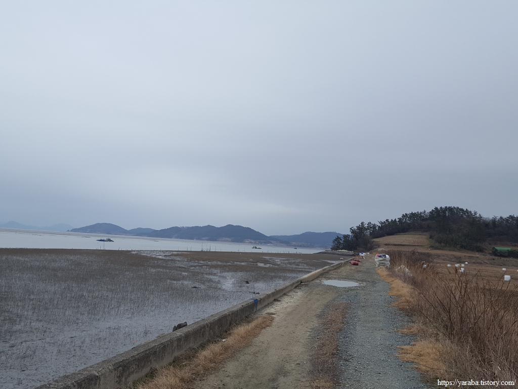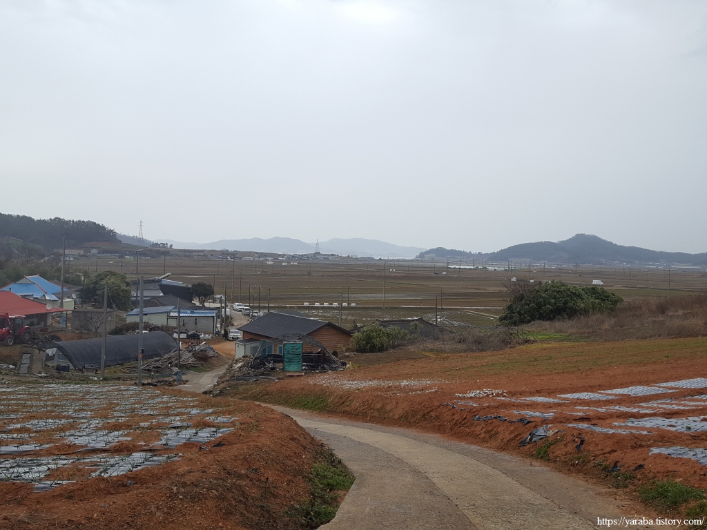 서동마을의 작은 언덕을 넘어서니 광활한 간척지와 함께 멀리 참도 선착장 인근과 지도 동북쪽 끝자락의 산지가 시야에 들어온다.