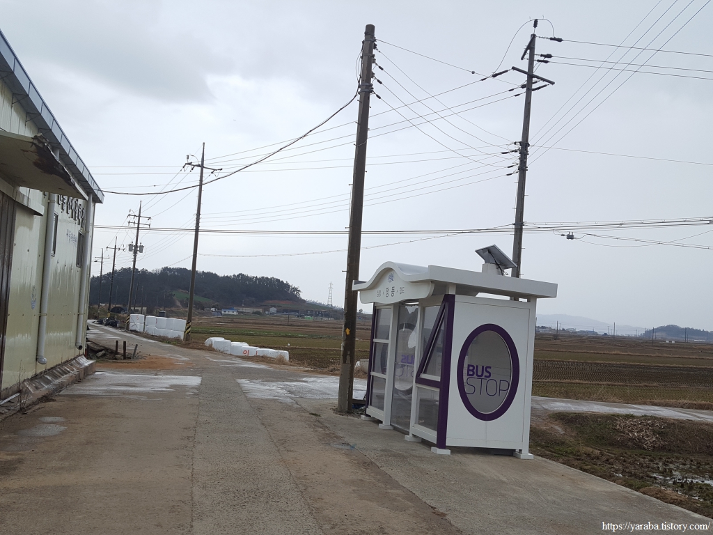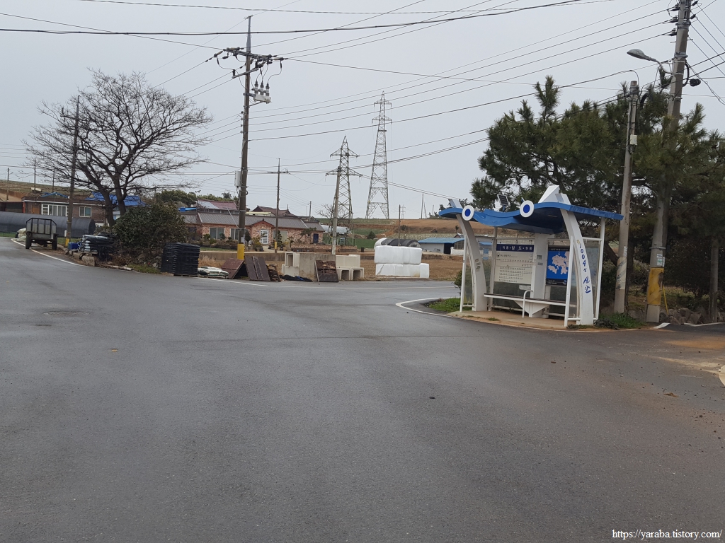길은 참도마을 중심부를 가로질러간다. 참도 버스 정류장에 눈이 두 개 달렸다. 아마도 게를 형상화해서 정류장을 만든 모양이다.