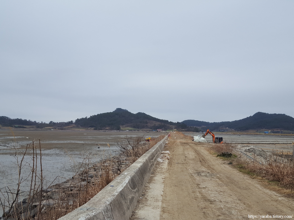 해안 방조제를 따라 걷는데 방조제 우측으로는 대단위 염전이 펼쳐 있다. 올해 소금 생산을 위한 작업 준비가 한창이다. 염전에서는 오늘처럼 비가 오락가락하고 흐린 날은 영 마뜩지 않을 것이다.
