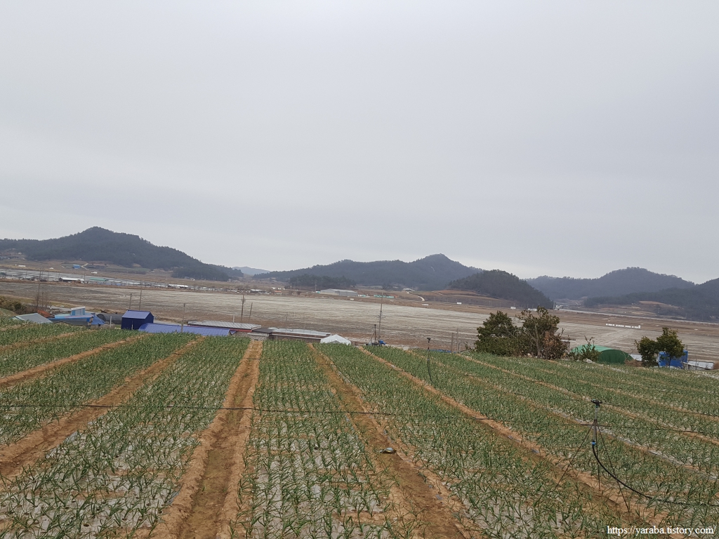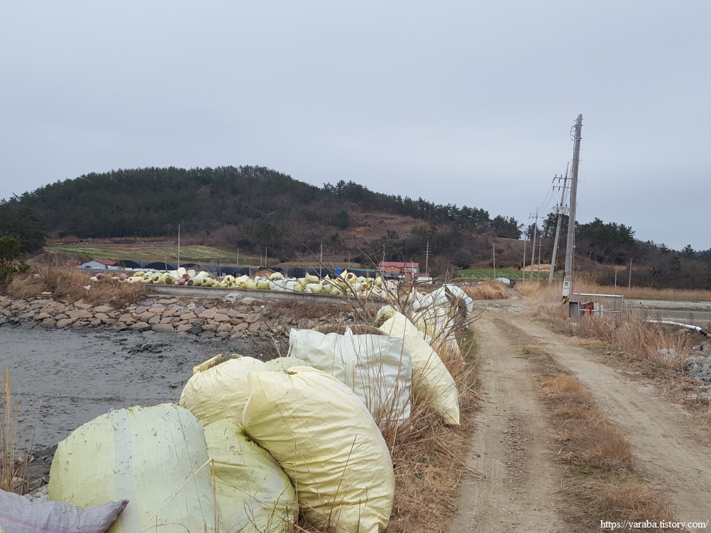 제방과 간척으로 만들어진 광활한 들판은 논 아니면 염전이다. 무안과 멀지 않아서 그런지 이곳도 구릉지에 양파를 재배하는 곳이 많은 모양이다. 이 근처에서 역방향으로 걷는 중년 부부를 만났다. 오락가락하는 겨울비 가운데 걷는 부부 커플을 만나니 왠지 동지를 만난 느낌이다. 간단한 인사만으로도 분위기가 새로워진다.