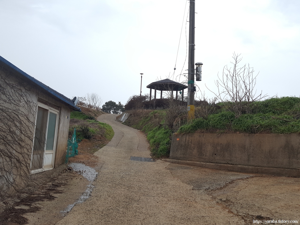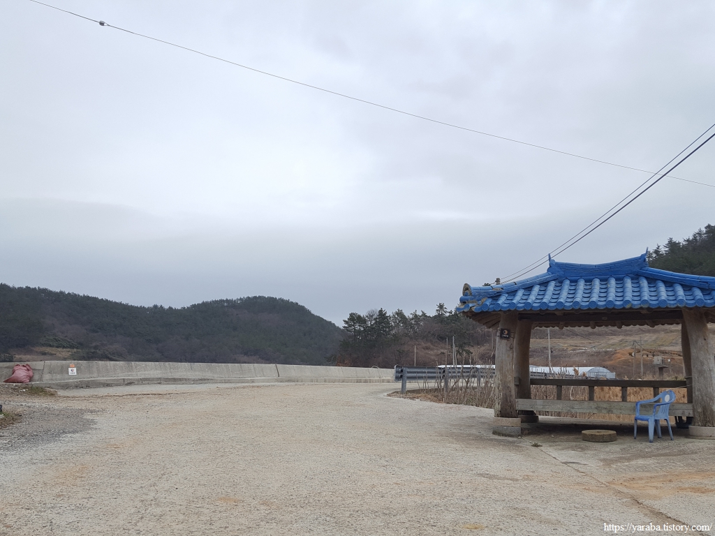 날씨가 흐리더니 겨울비가 내리기 시작한다. 마을 정자에 앉아서 마을 앞바다를 보면서 이른 점심도 해결하고 잠시 쉬어간다. 추운 날씨에 비까지 내리니 몸이 오들오들 거린다. 조용하던 마을에 인근 성당 이름이 적힌 승합차가 한대 서더니 주민을 한 분을 내려주고는 휑하니 가버린다.