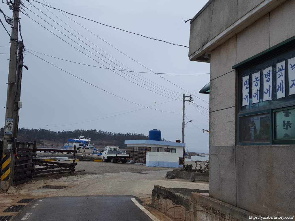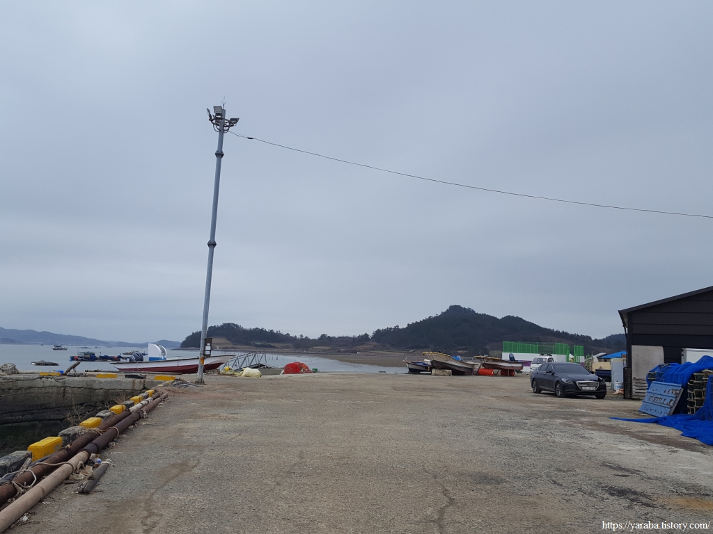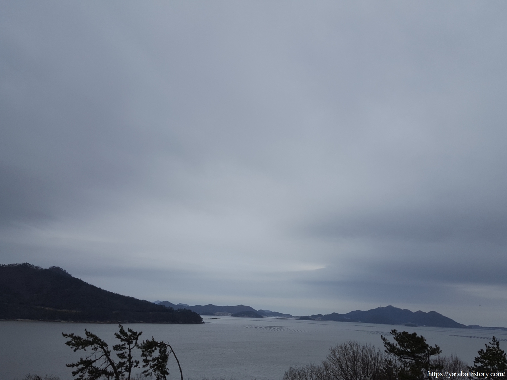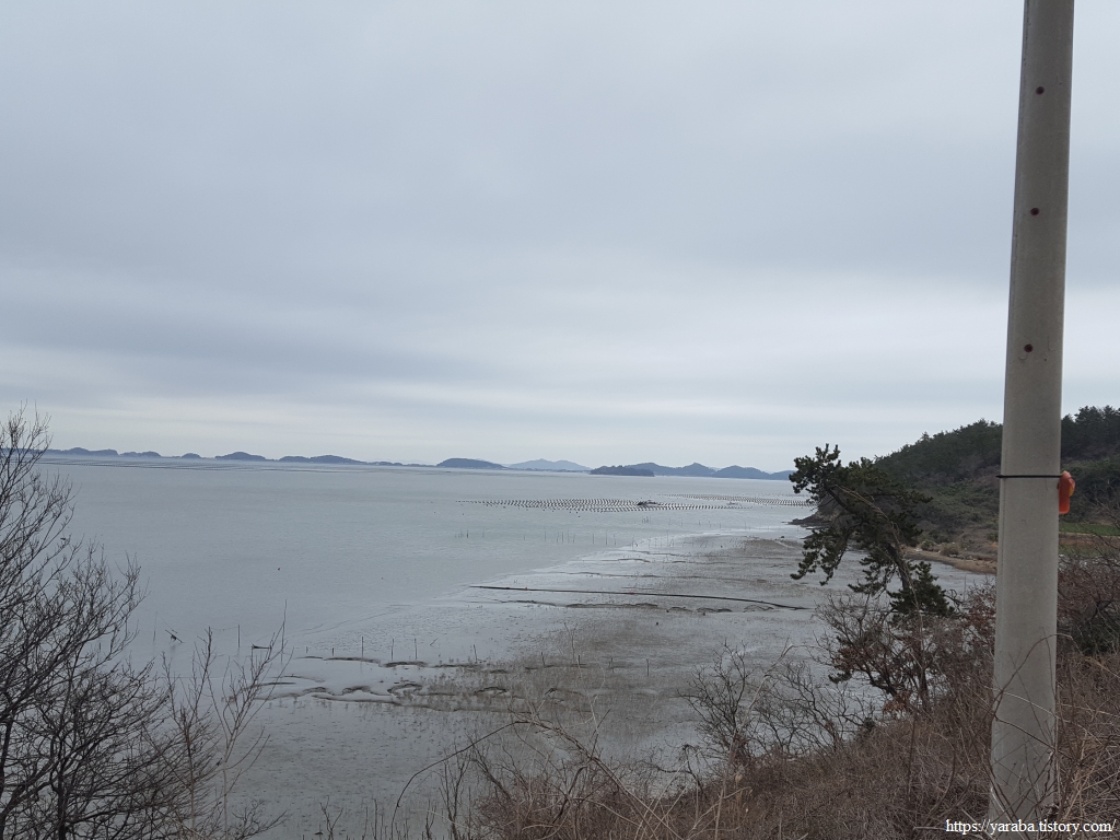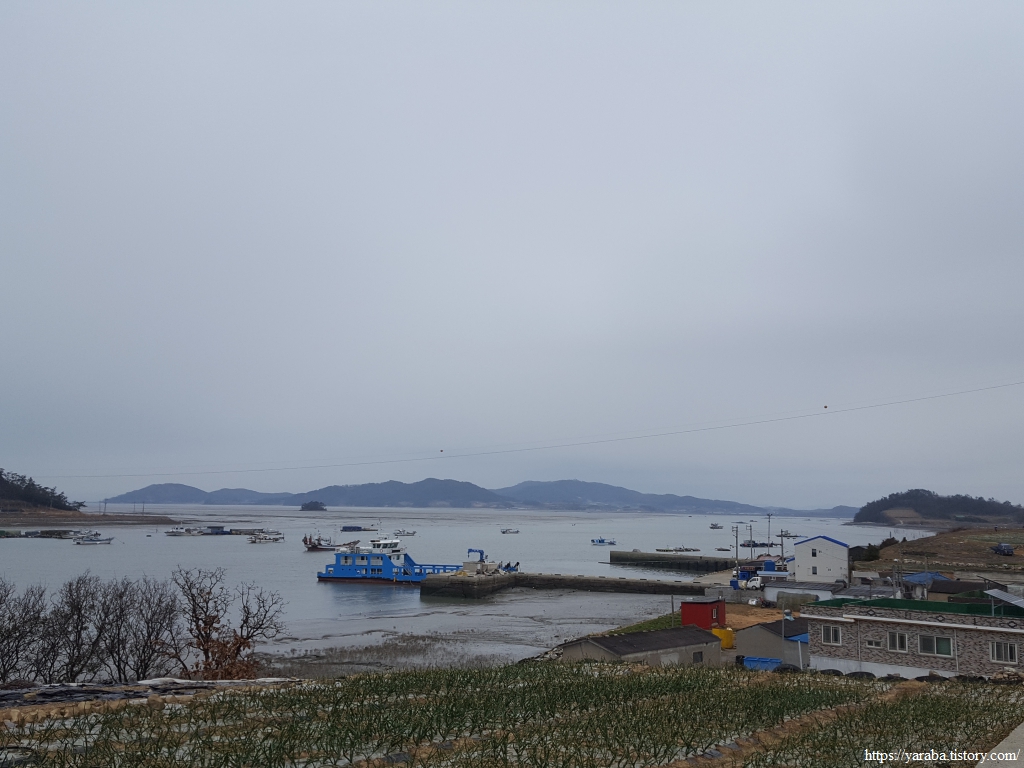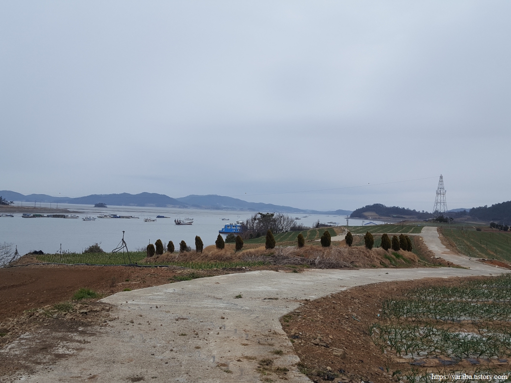 언덕 위에서 바라본 참도 선착장 방향의 해안 풍경이다. 날이 흐리고 서늘해서 추위를 견디기 어렵지만, 나름 감성적인 분위기를 자아낸다.