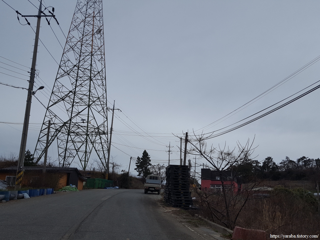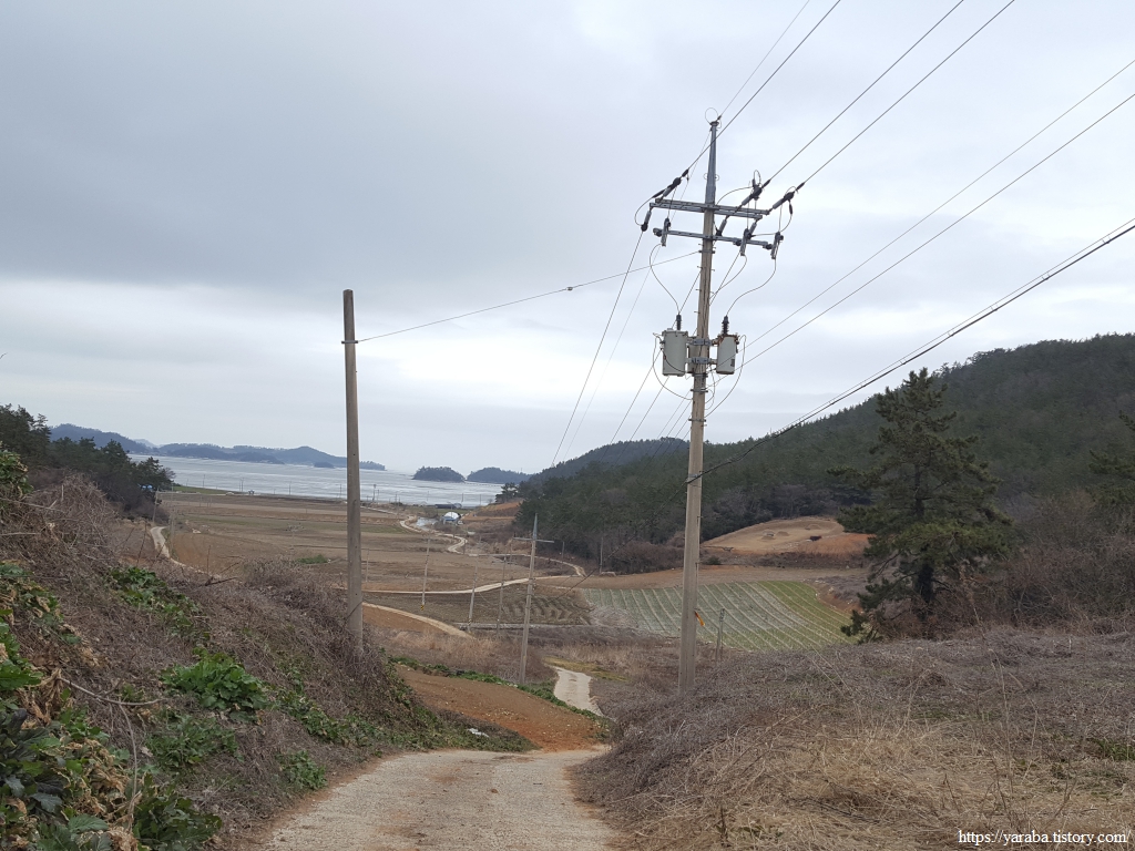 지도에서 큰포작도로 이어지는 송전탑 아래를 지나서 언덕을 지나 이어지는 해안길로 나간다.