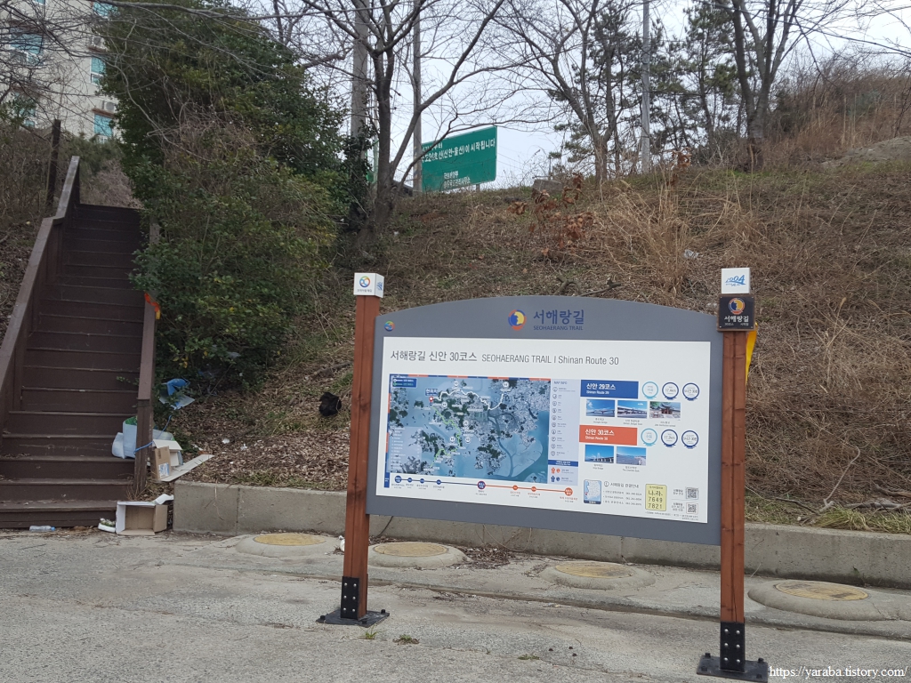 서해랑길 30코스는 점암항 뒤편으로 올라가 임자대교 방면으로 이동한다. 국도 24호선이 이곳에서 시작한다는 표지판이 있다. 이곳 임자교차로에서 울산 태화강의 삼호교남 교차로까지 서해안에서 동해안까지 한반도 남부를 동서로 가로지르는 404Km에 이르는 도로이다. 24번 국도의 종점인 상호 교남 교차로는 울산 태화강 주위를 걷는 해파랑길 7코스를 걸으며 지나갔던 인연이 있는 곳이다