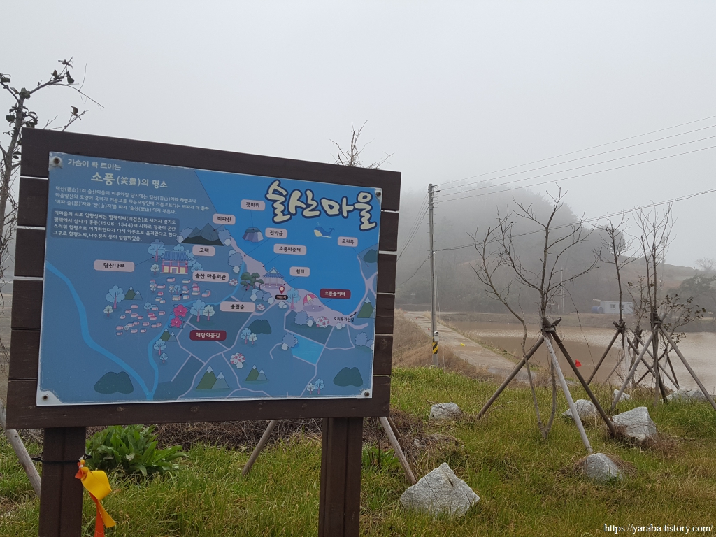 슬산제 인근에 도착하니 슬산마을을 소개하는 글과 지도를 만날 수 있었다. 그런데, 소풍(笑豊)의 명소라 해서 어린 시절 가던 소풍 가기 좋은 곳이라 생각했는데, 한자가 바람을 쏘인다라는 의미의 소풍(逍風)이 아니었다. 웃을 소(笑)에 풍년 풍(豊)을 사용해서 웃음이 많다는 의미였다. 의도한 바인지는 모르겠으나 바람 쐬기도 좋고, 큰 웃음 지으며 스트레스를 날리기에도 좋은 명소라는 의미면 충분하다 싶다.